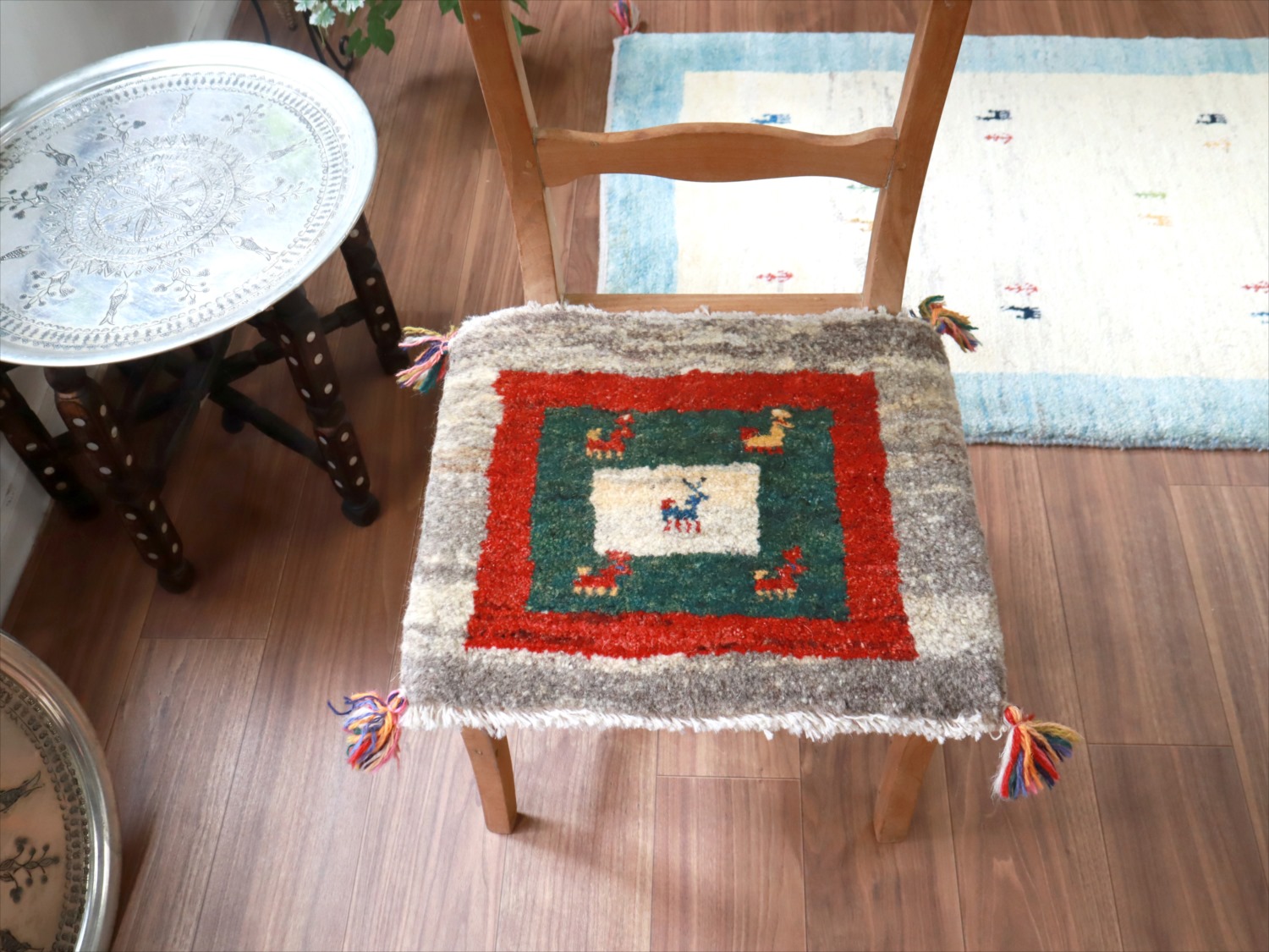 【15%OFF】ギャッベ イラン産手織り 座布団サイズ 39x45cm ナチュラルグレー グリーン/レッド