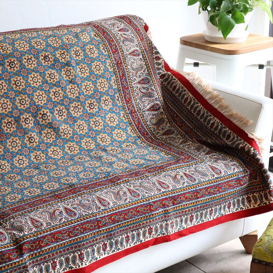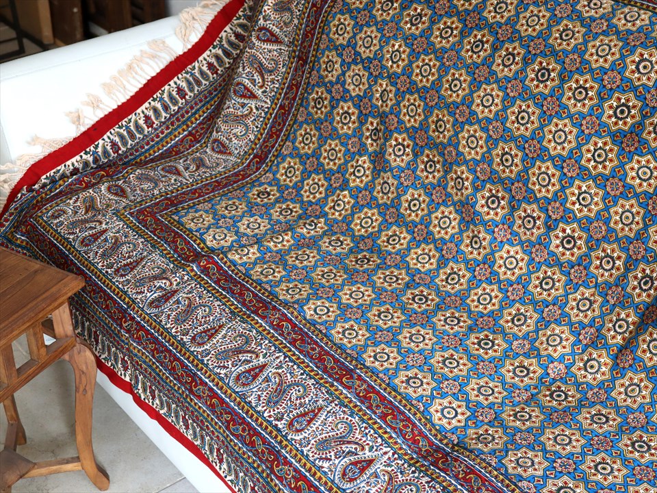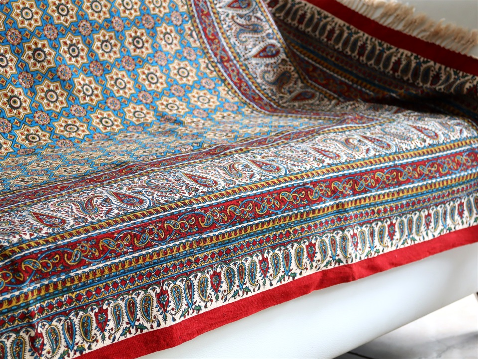 Key:コットン 染色 ブロックプリント 木版 捺染 伝統工芸 ペルシャブルー ペイズリー フリークロス マルチカバー ベッドスプレッド ベッドカバー ソファカバー カーテン タペストリー ファブリック インテリアファブリック クラフト インテリア ペルシャ ペルセポリス イラン 中東 シルクロード アジアン エスニック 200cmサイズ