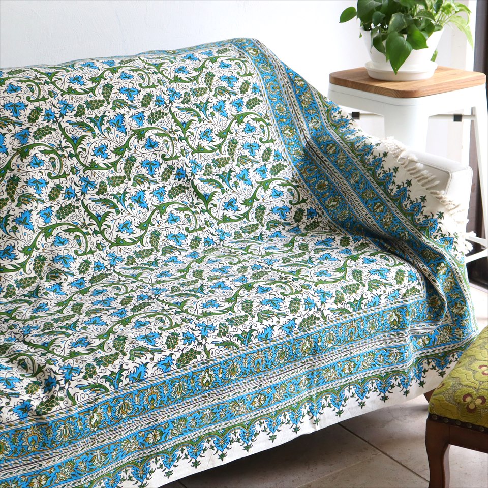 Key:コットン 染色 ブロックプリント 木版 捺染 伝統工芸 ペルシャブルー ペイズリー フリークロス マルチカバー ベッドスプレッド ベッドカバー ソファカバー カーテン タペストリー ファブリック インテリアファブリック クラフト インテリア ペルシャ ペルセポリス イラン 中東 シルクロード アジアン エスニック 200cmサイズ
