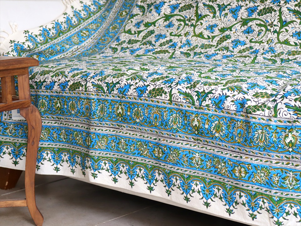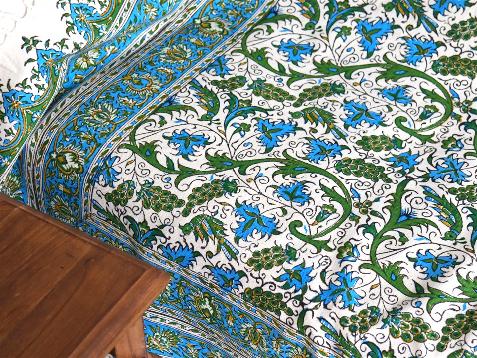 【15%OFF】ペルシャ更紗 イラン手染め布 204x132cm ブルー系 葡萄柄 テーブルクロス ソファカバー