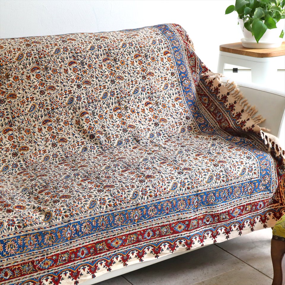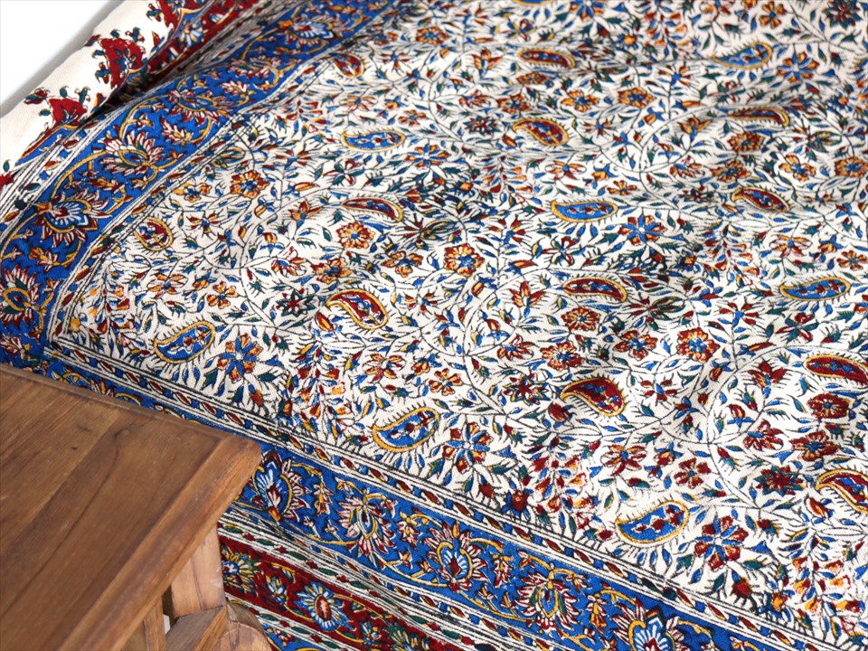 Key:コットン 染色 ブロックプリント 木版 捺染 伝統工芸 ペルシャブルー ペイズリー フリークロス マルチカバー ベッドスプレッド ベッドカバー ソファカバー カーテン タペストリー ファブリック インテリアファブリック クラフト インテリア ペルシャ ペルセポリス イラン 中東 シルクロード アジアン エスニック 200cmサイズ