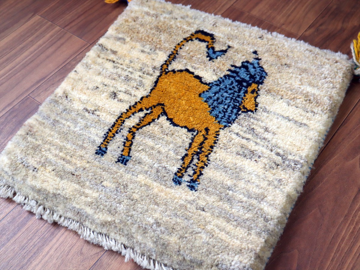 - 【15%OFF】ギャッベ イラン産手織り 座布団サイズ 43×42cm ナチュラルアイボリー ブルーのたてがみを持つライオン