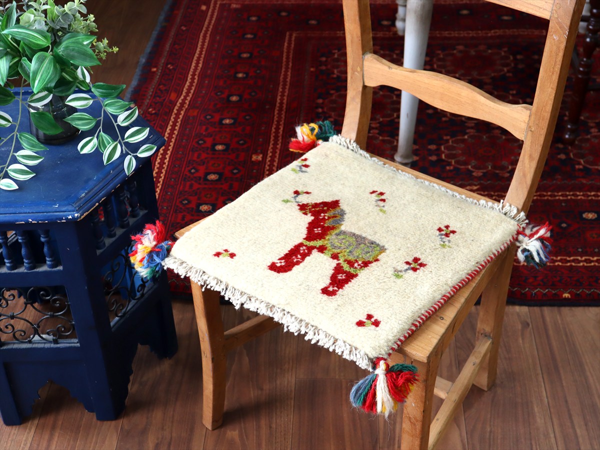- 【15%OFF】ギャッベ イラン産手織り 座布団サイズ 37×38cm ナチュラルアイボリー フラワーと馬