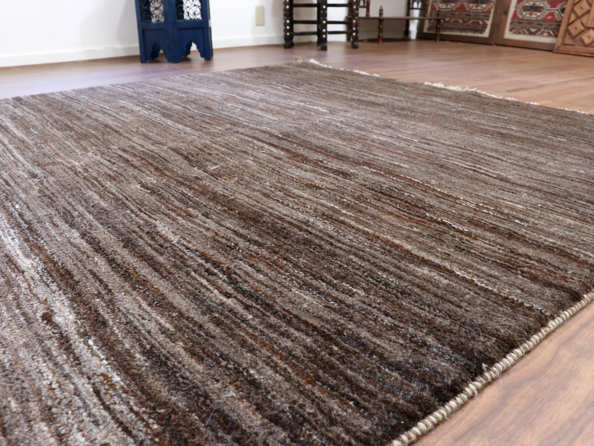 染めていない天然の羊毛の色だけで、見事な深みのあるグラデーションを織りあげています。ダークブラウン、グレー、ベージュなどが複雑にミックスして、手織りならではのまさに世界に一枚のラグです。