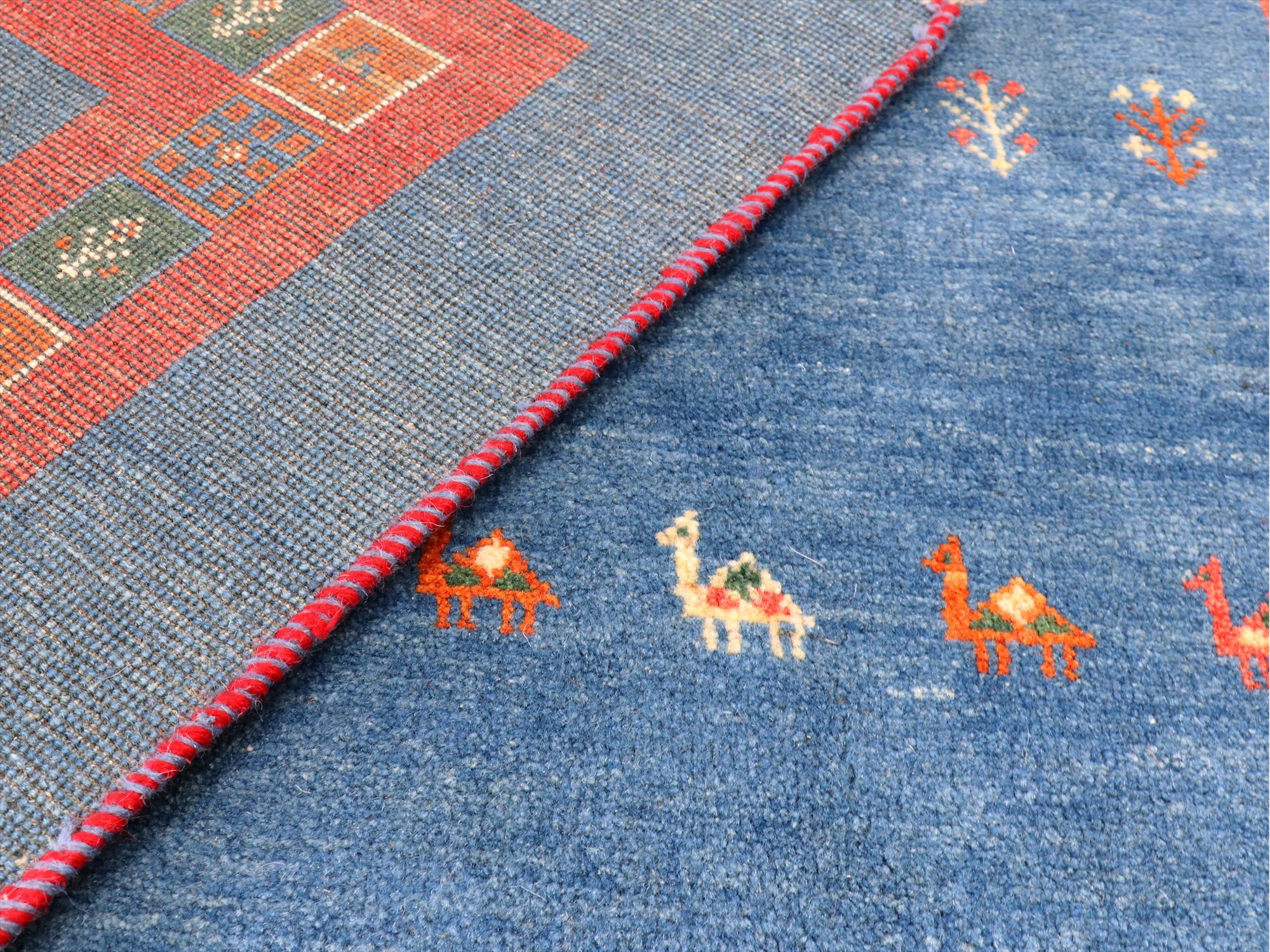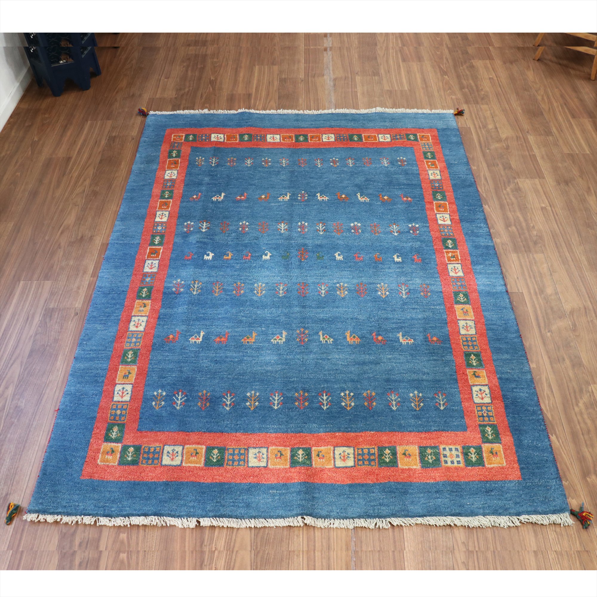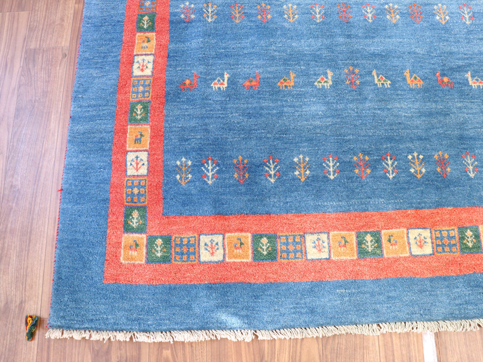 明るいブルーとレッドのコンビネーションでやさしい印象のギャッベ。同じく明るめのフローリングに合わせると、カジュアルな雰囲気で楽しめそうです。デザインは、動物やラクダなどのモチーフが全面に織り込まれた定番の人気デザイン。昔ながらの素朴な織りです。
