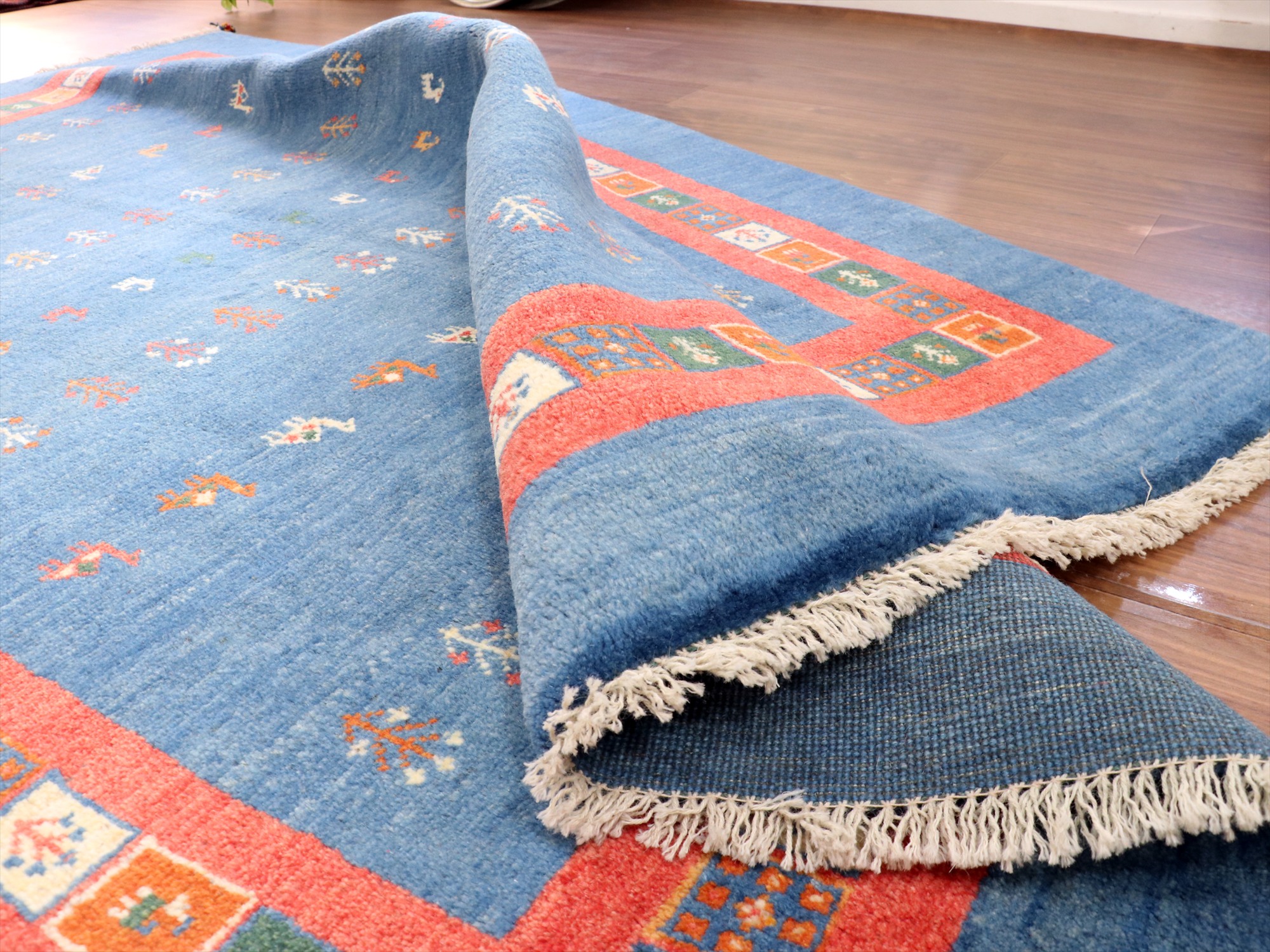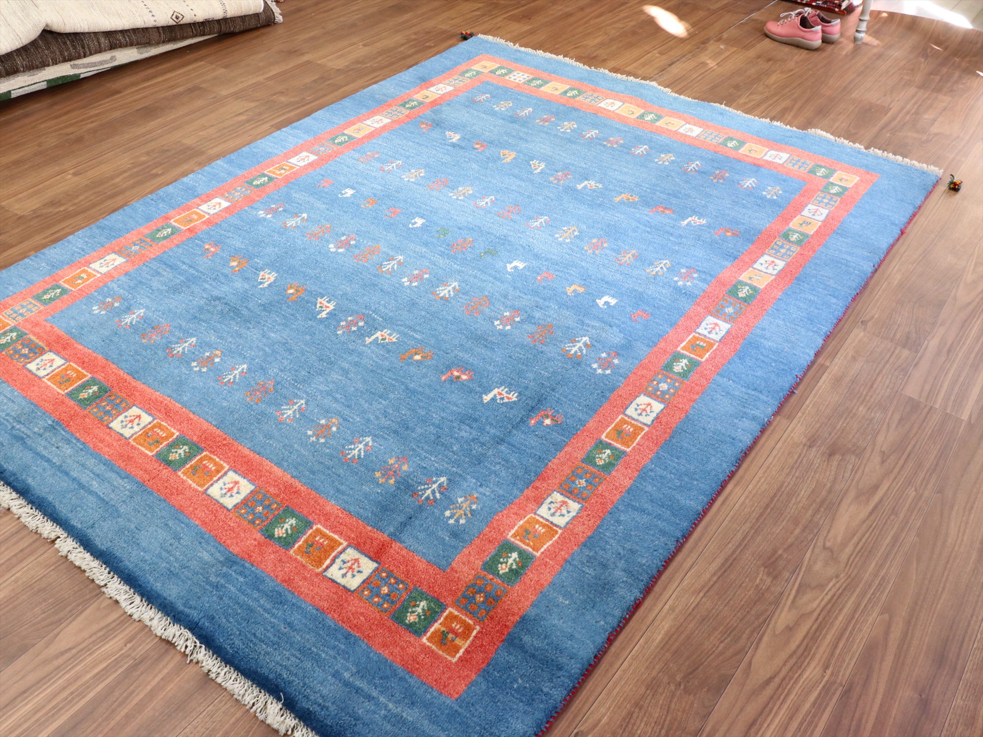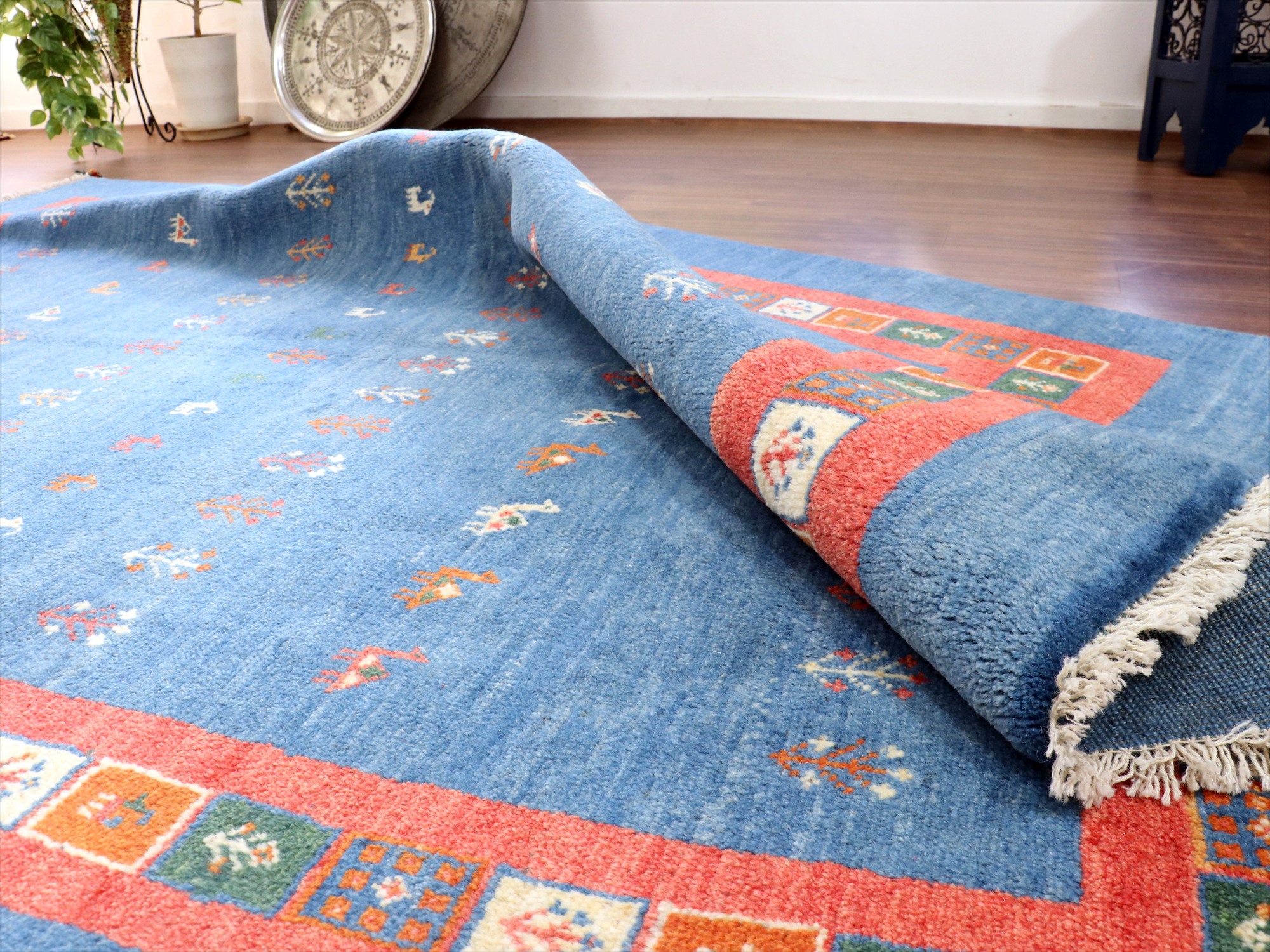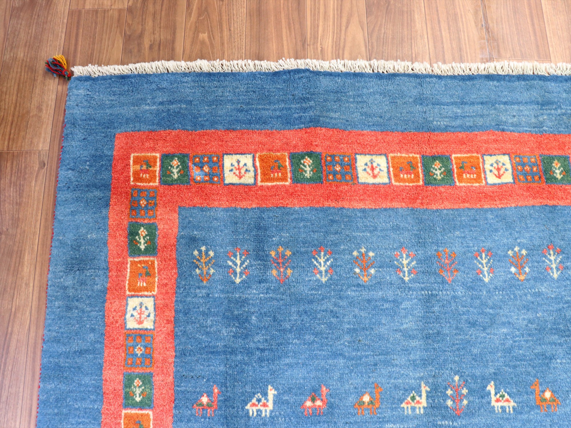 明るいブルーとレッドのコンビネーションでやさしい印象のギャッベ。同じく明るめのフローリングに合わせると、カジュアルな雰囲気で楽しめそうです。デザインは、動物やラクダなどのモチーフが全面に織り込まれた定番の人気デザイン。昔ながらの素朴な織りです。