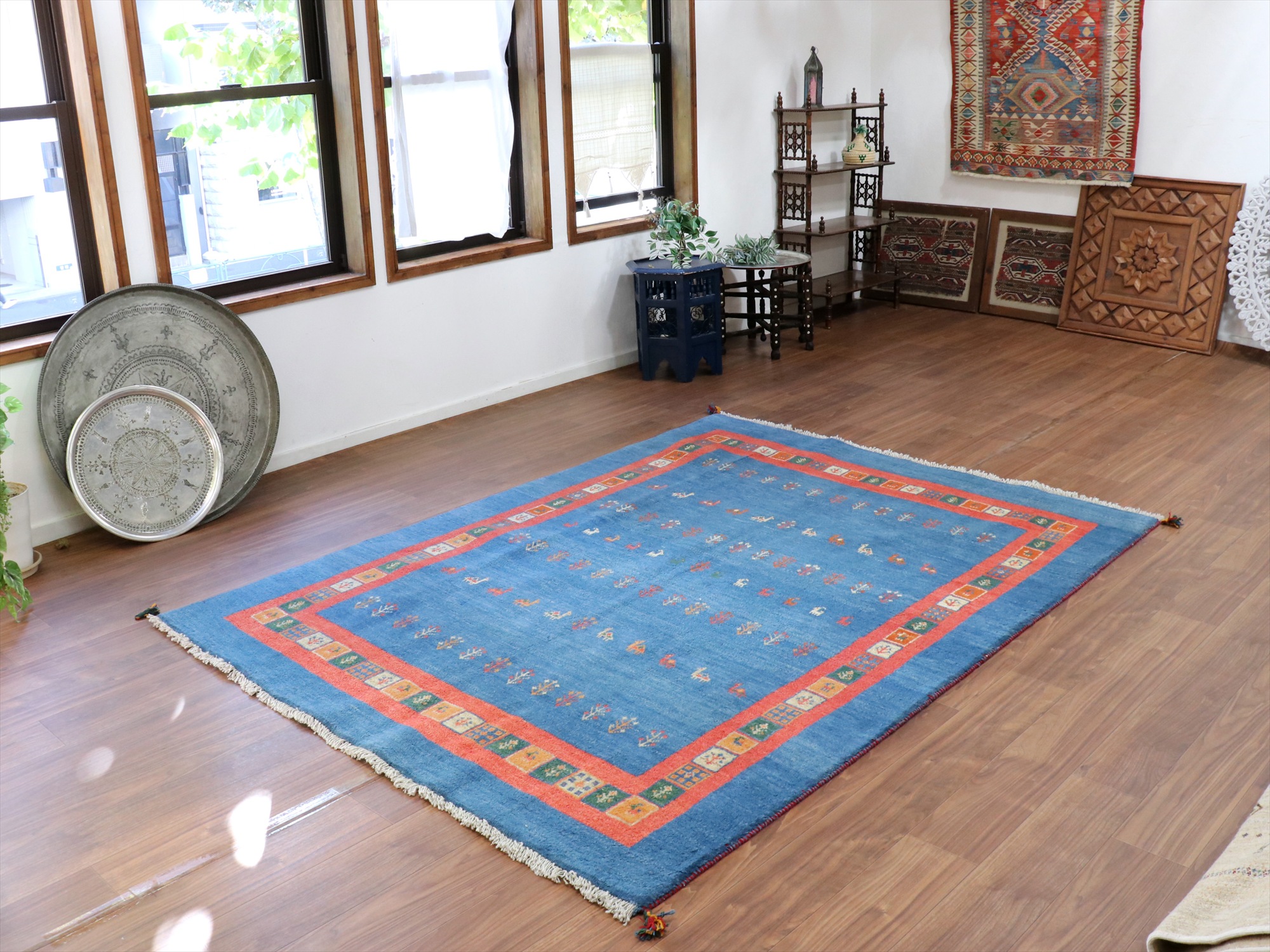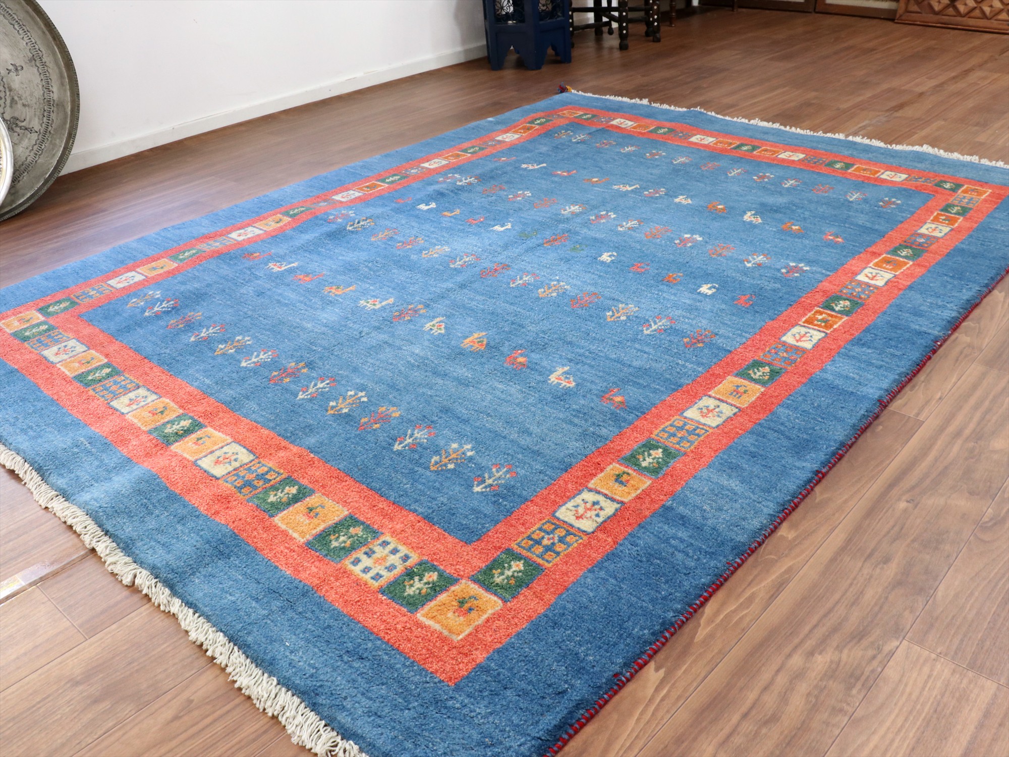 Key:ギャベ, ラグ, 手織り絨毯, 部族絨毯, カシュカイ族, ウール製, ブルー, 青色, タイル, リビング, ダイニング, ソファ前, 厚手, 東京,中野区, ガラタバザール, Gabbeh, Tribal Rug, Hand knotted, wool, Shiraz, Fars, Quashkai