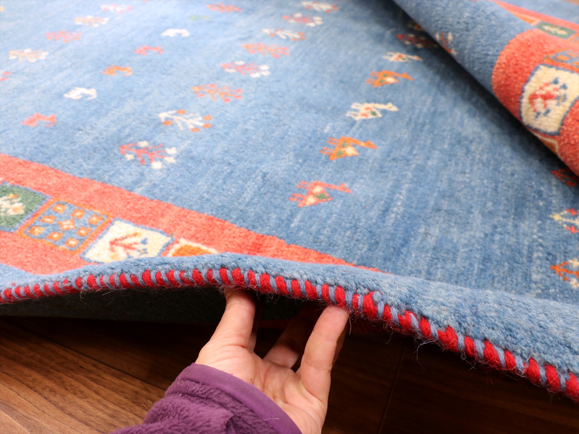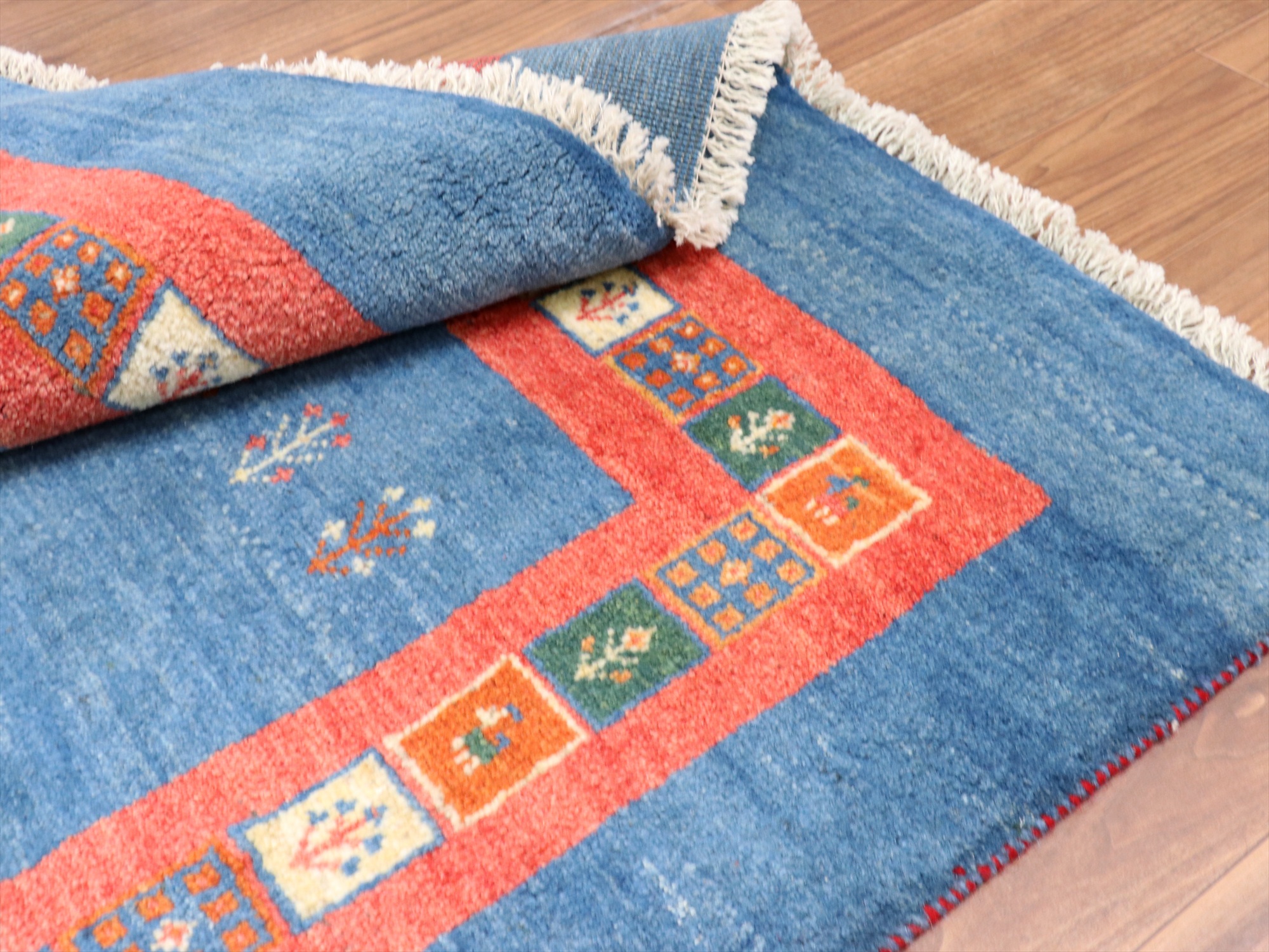 毛足を含めたギャッベの厚みは2cm弱で、ぎゅっと目の詰まった織り。丁寧な仕上げで、ほとんど遊び毛がありません。