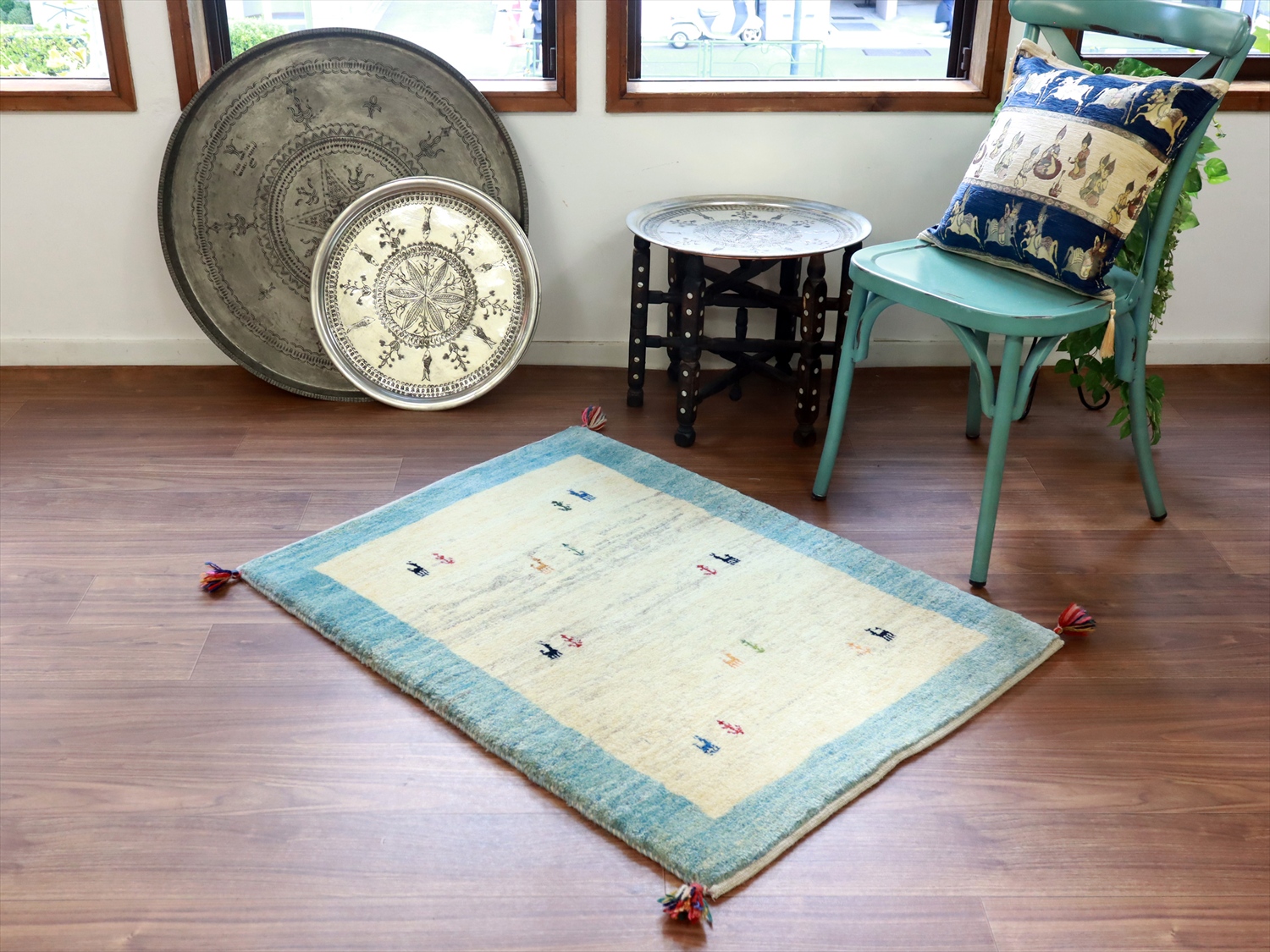 - 【15%OFF】ギャッベ イラン 手織りラグ 112x82cm ナチュラルアイボリー 水色