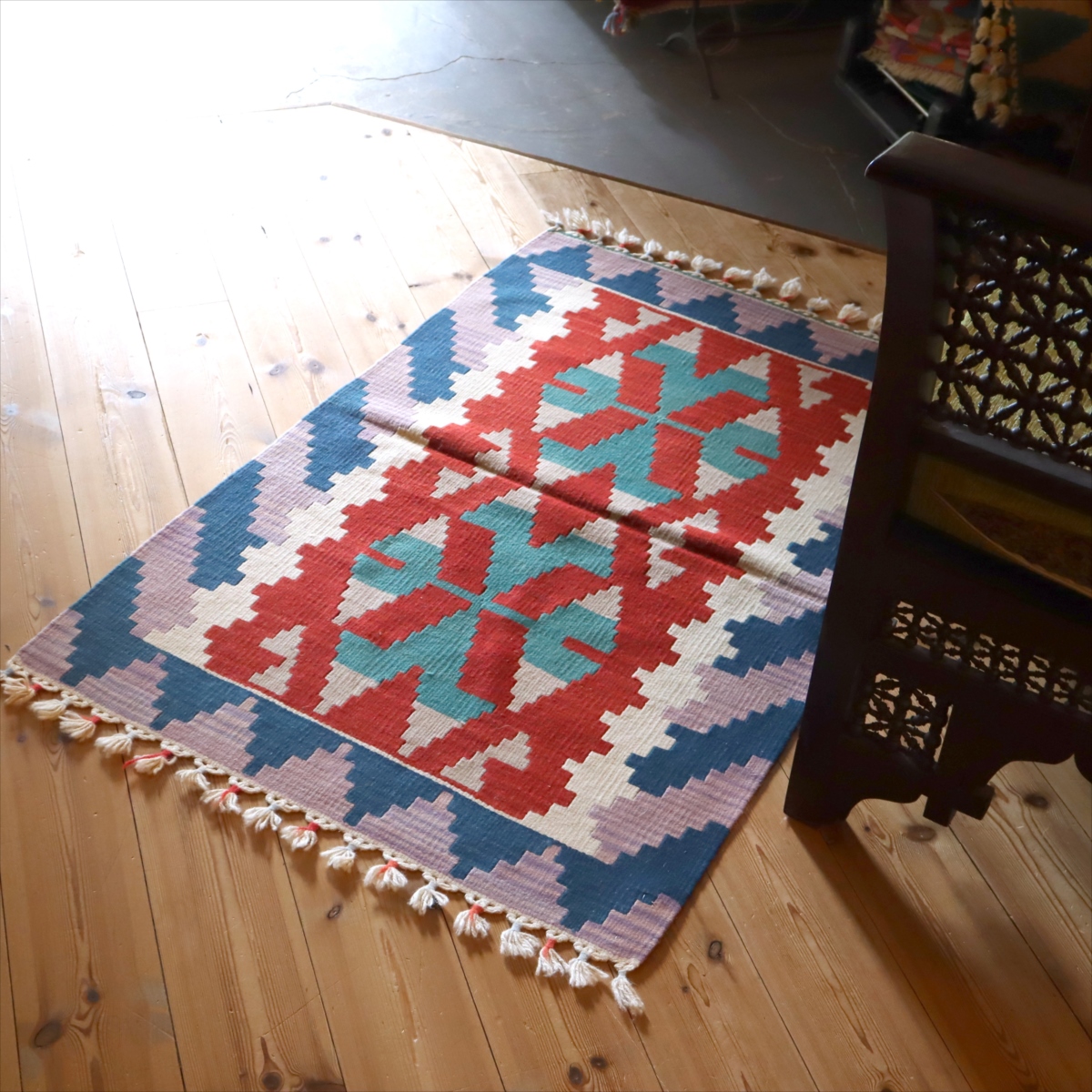 トルコキリムらしい伝統的なスタイルで織られているカイセリ産のキリムです。カイセリ地方は、トルコの中央部、カッパドキアに近く、古い時代から多くの諸品が集まり、現在でも絨毯やキリム産業の中心となっています。工業製品にはないあたたかさがあり、我が家のキリムとして愛着の持てる一枚になってくれます。