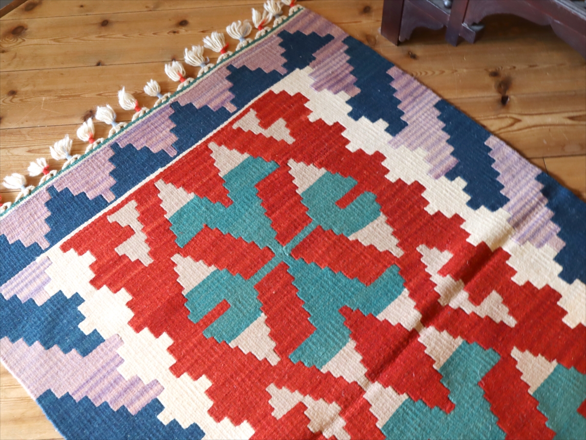 織り地がしなやかでやわらかいのがカイセリキリムの特徴です。やや厚みがあり、やさしい肌触り。色の切り替え部分には、キリムの織りの特徴で、縦に隙間が開いています(スリットと呼んでいます)。