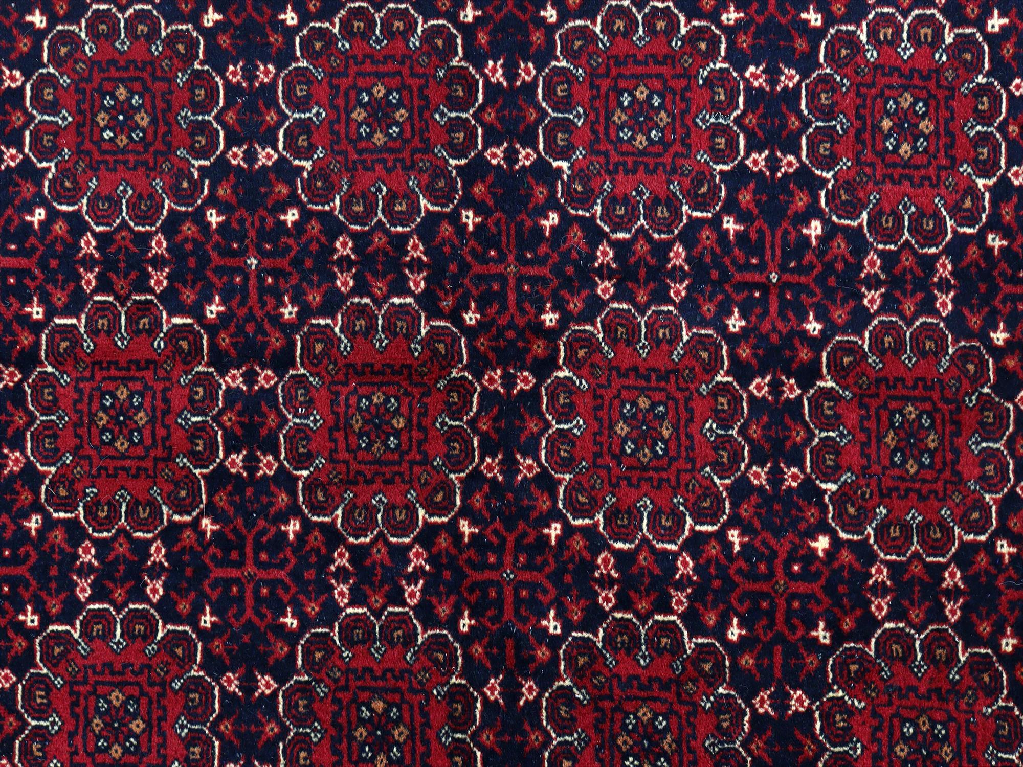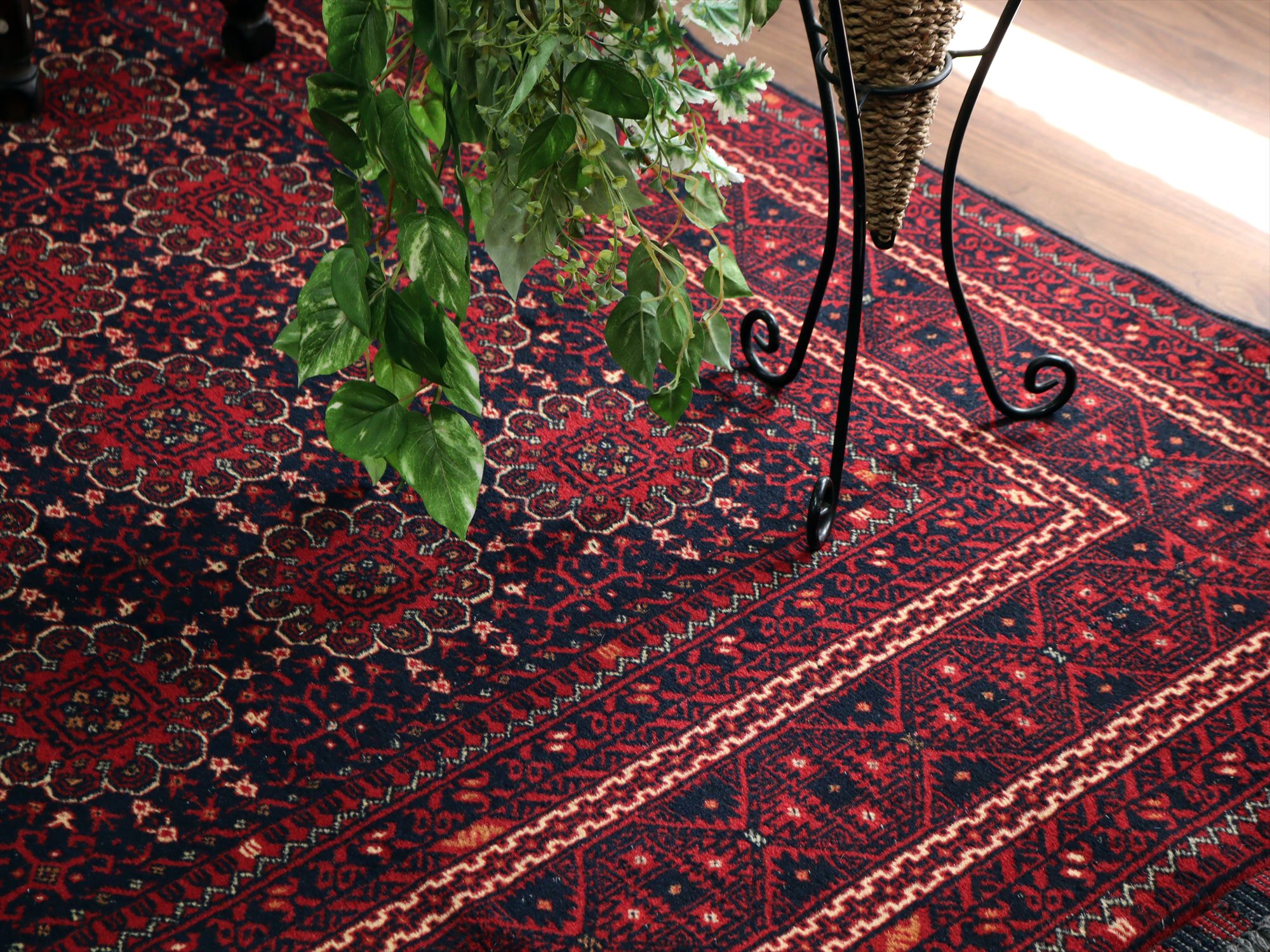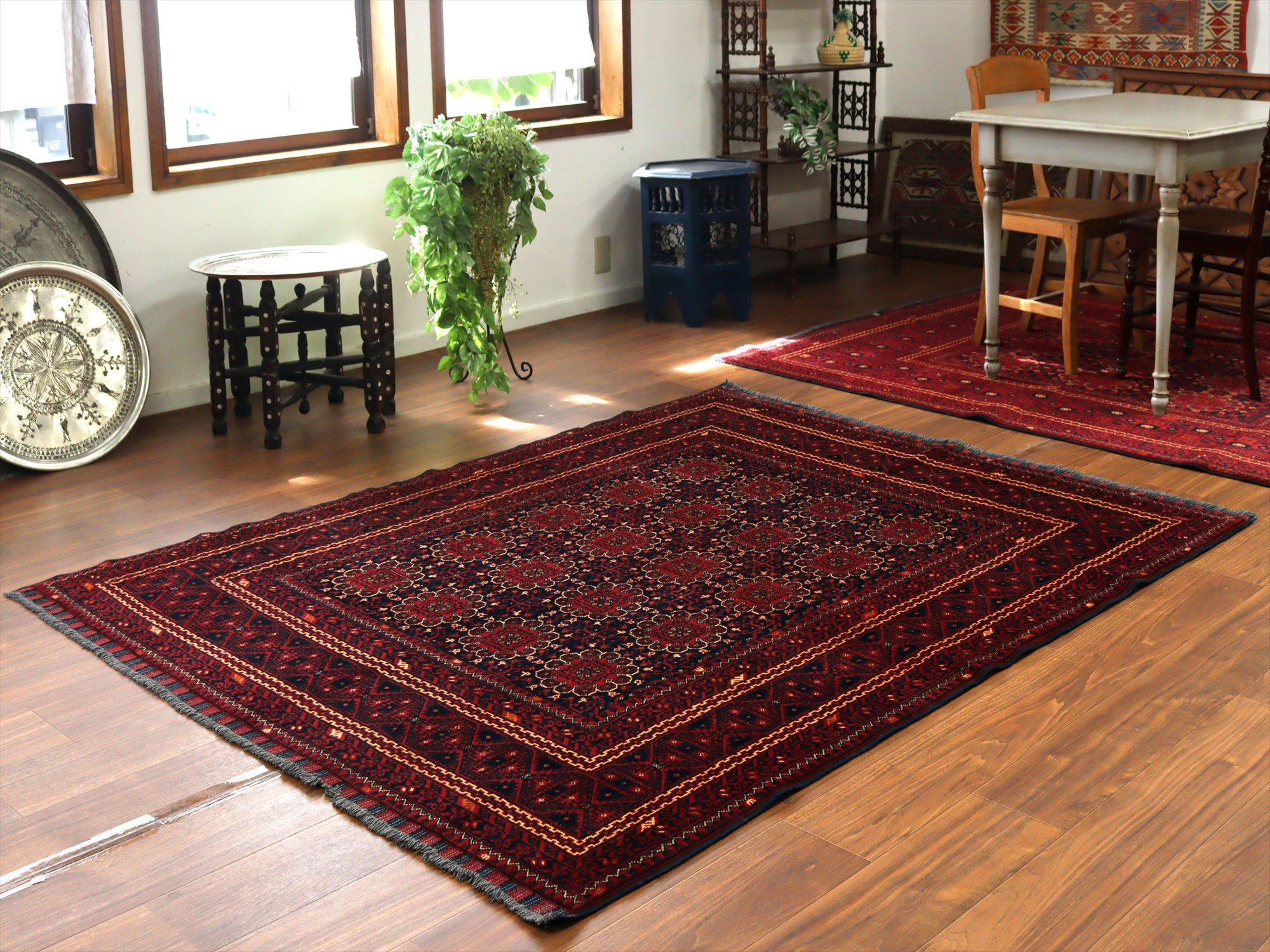光沢のあるビロードのような、滑らかでツヤのある細かな織りの、アフガニスタン北部・クンドゥズ地方で織られた高級絨毯です。トルコのイスタンブールにおいても、ツーリストに大変人気があります。色はとても深い赤で、黒色に見える濃紺との相性は抜群です。