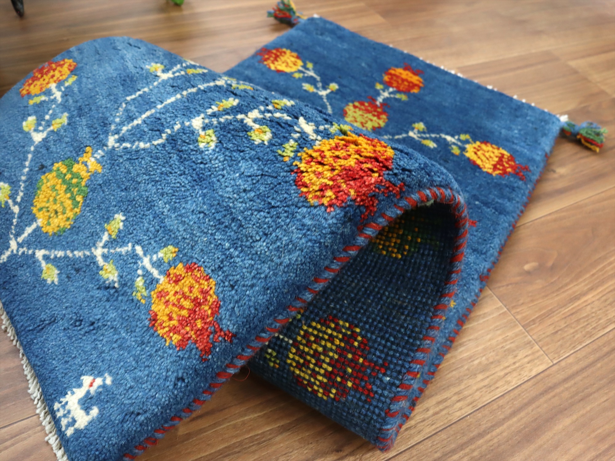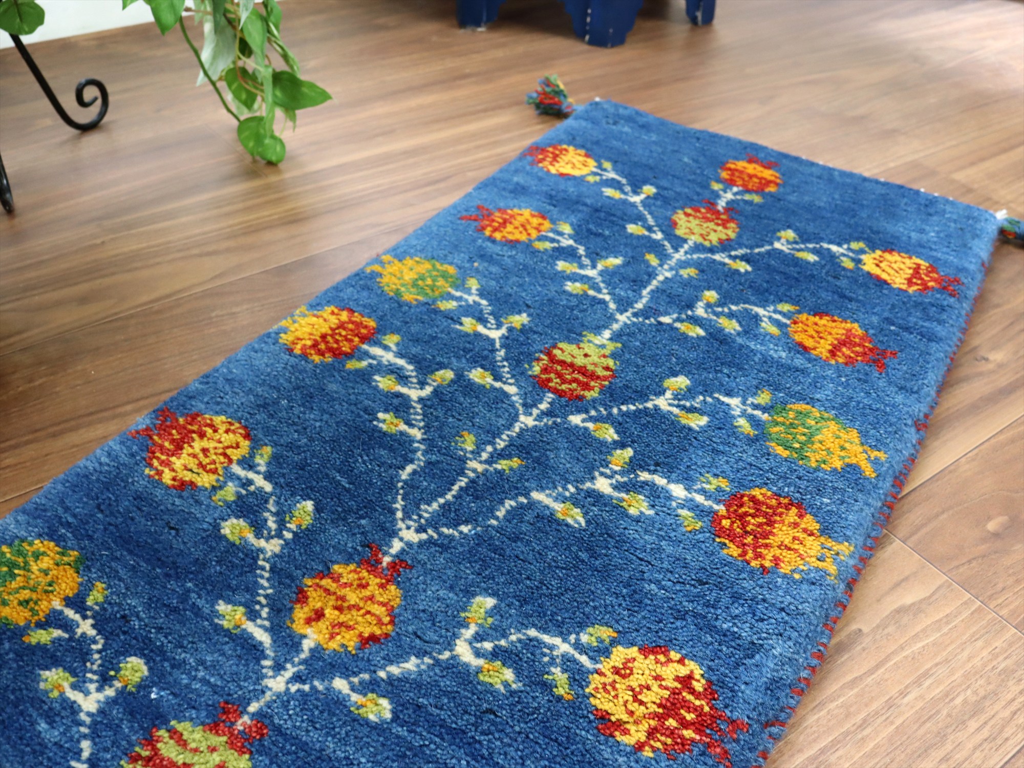 Key:ギャッベ, ギャベ, ザクロ, 細長, ランナー, 廊下, ベッドサイド, キッチン, 廊下, イラン, シラーズ, ペルシャ, バザールギャッベ, ポンポン, 手織り, 一点もの, 青, ブルー, ガラタバザール, 東京中野区