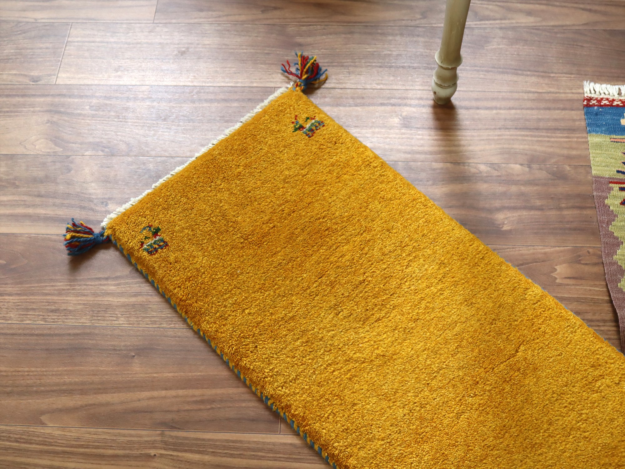 Key:ギャベ, ギャッベ,トライバルラグ,手織りラグ, 手織り絨毯, 部族絨毯, 草木染, カシュカイ族, ウール製, 廊下, ベッドサイド, オレンジ, イエロー, 黄色,一点もの, 手織り, 現品販売, 東京、中野区, ガラタバザール, Gabbeh, Tribal Rug, Hand knotted, wool, Natural dye, Shiraz, Fars, Quashkai