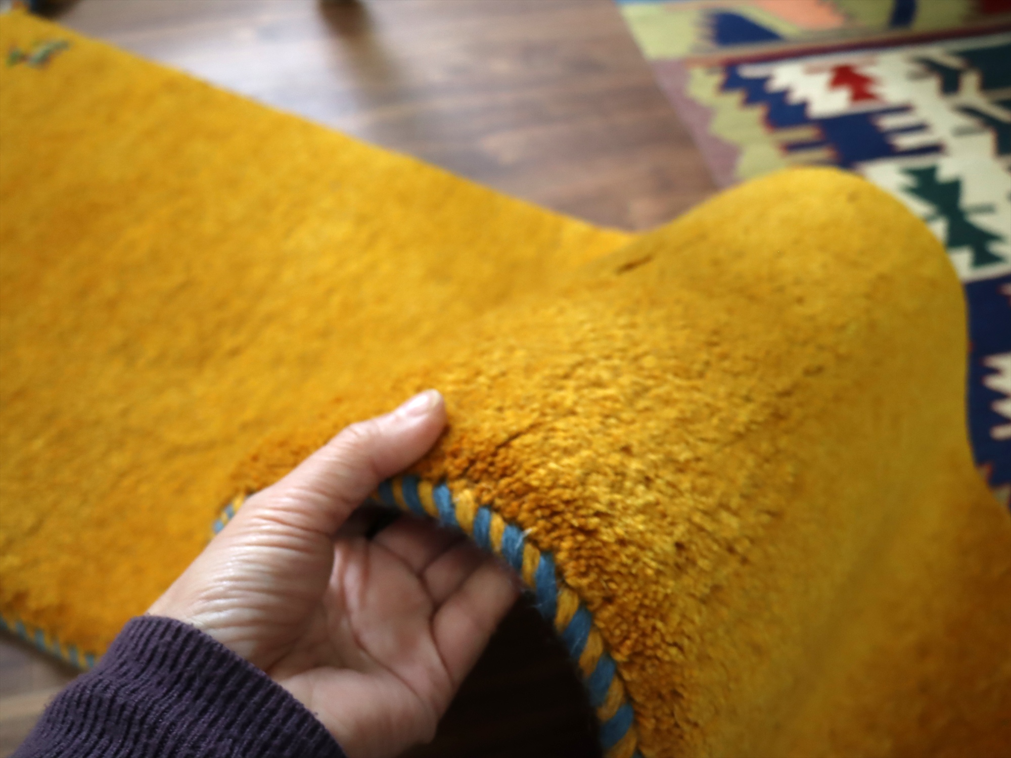 毛足(パイル)が長く、ふかふかとしたボリュームのある織りのギャッベです。ベースを含めたラグ全体の厚みは2cm前後。