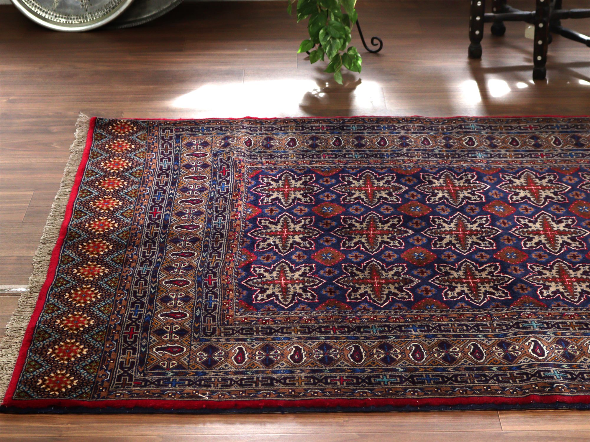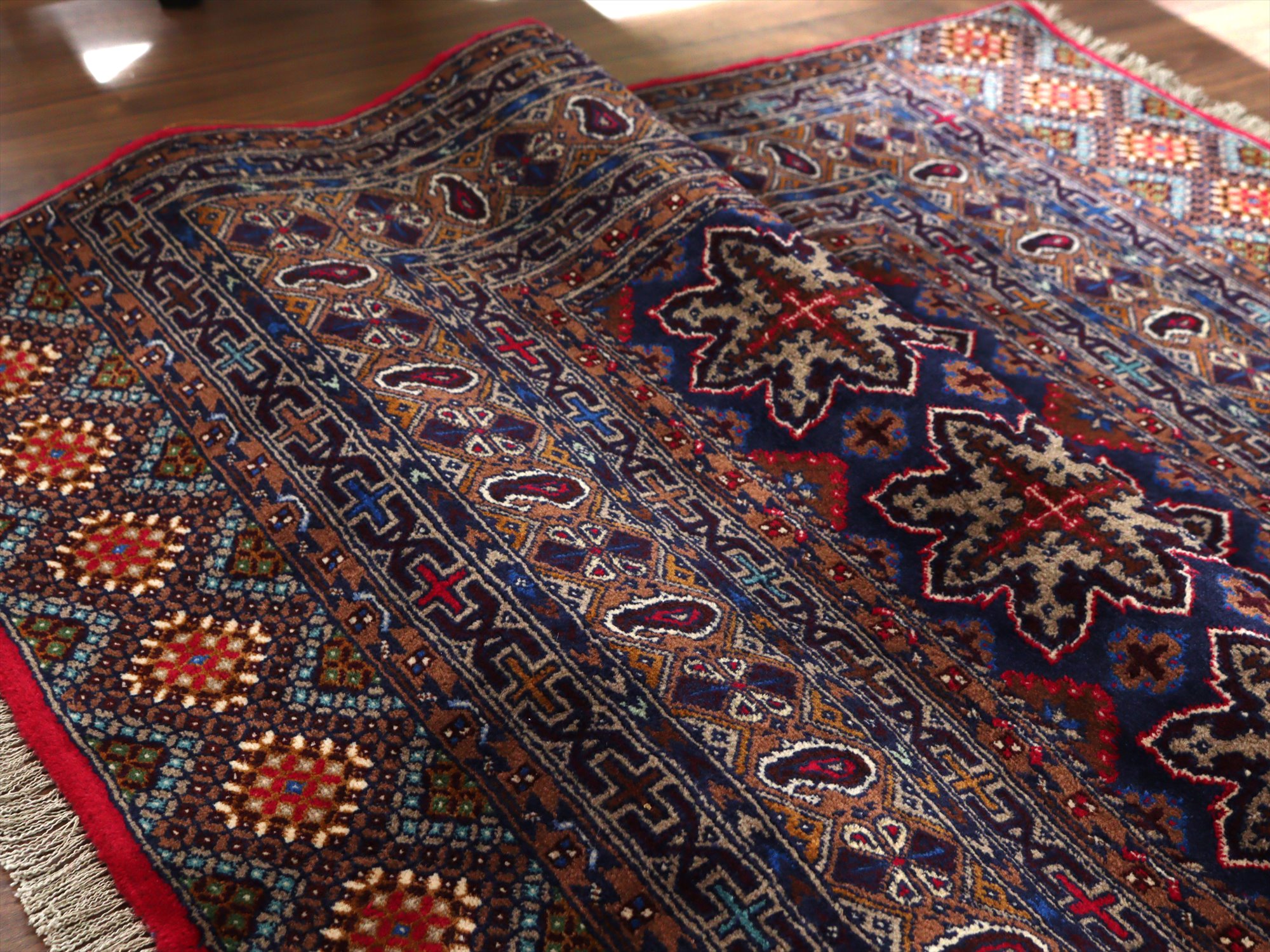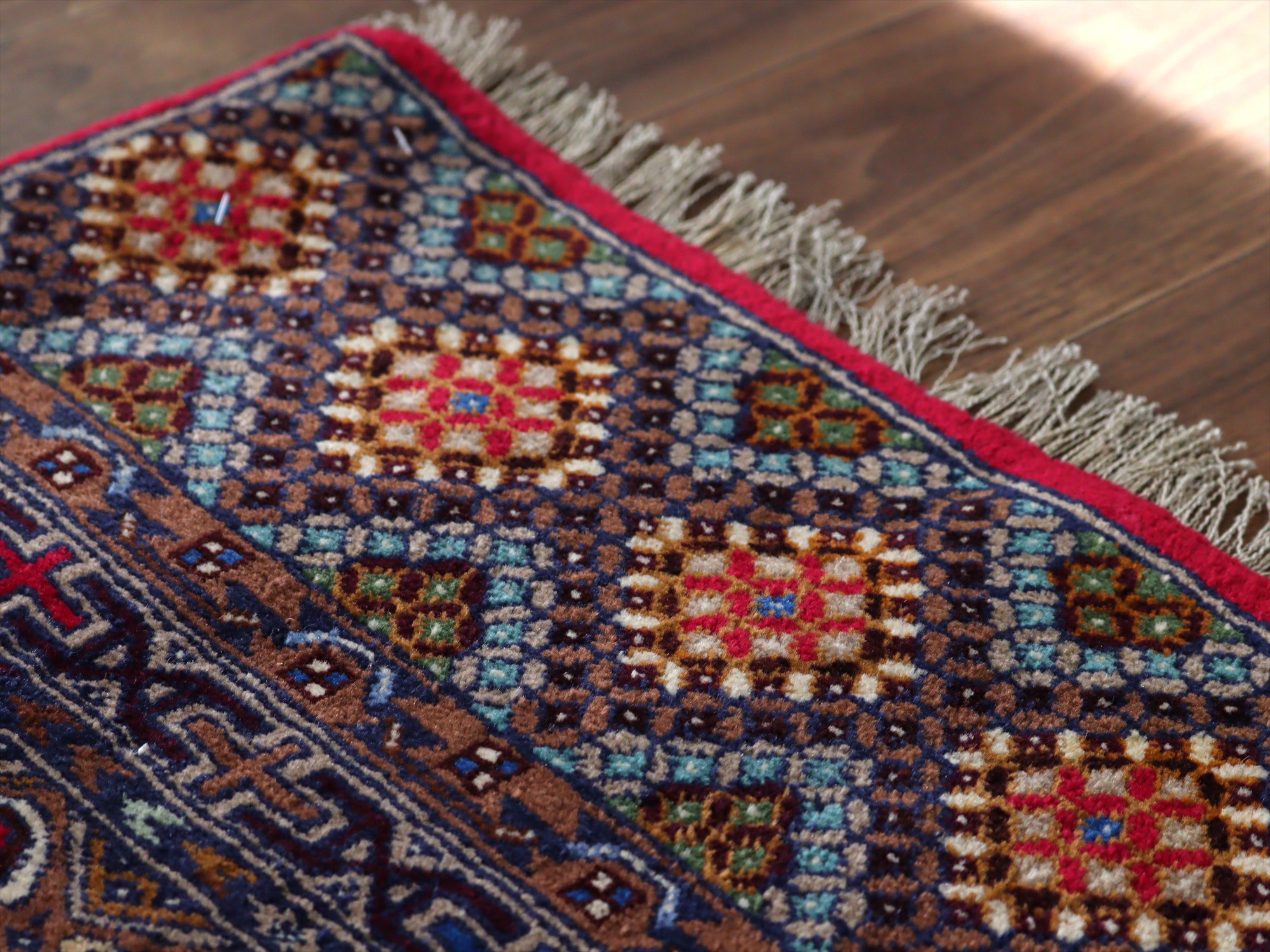 ダークトーンの色ベースに、細かな織りで幾何学模様がきっちりと整列するように織られたデザイン。独特の色使いでエキゾチックな雰囲気がよく出ています。額縁部分には、細く赤の色糸で枠が成されていてアクセントになっています。