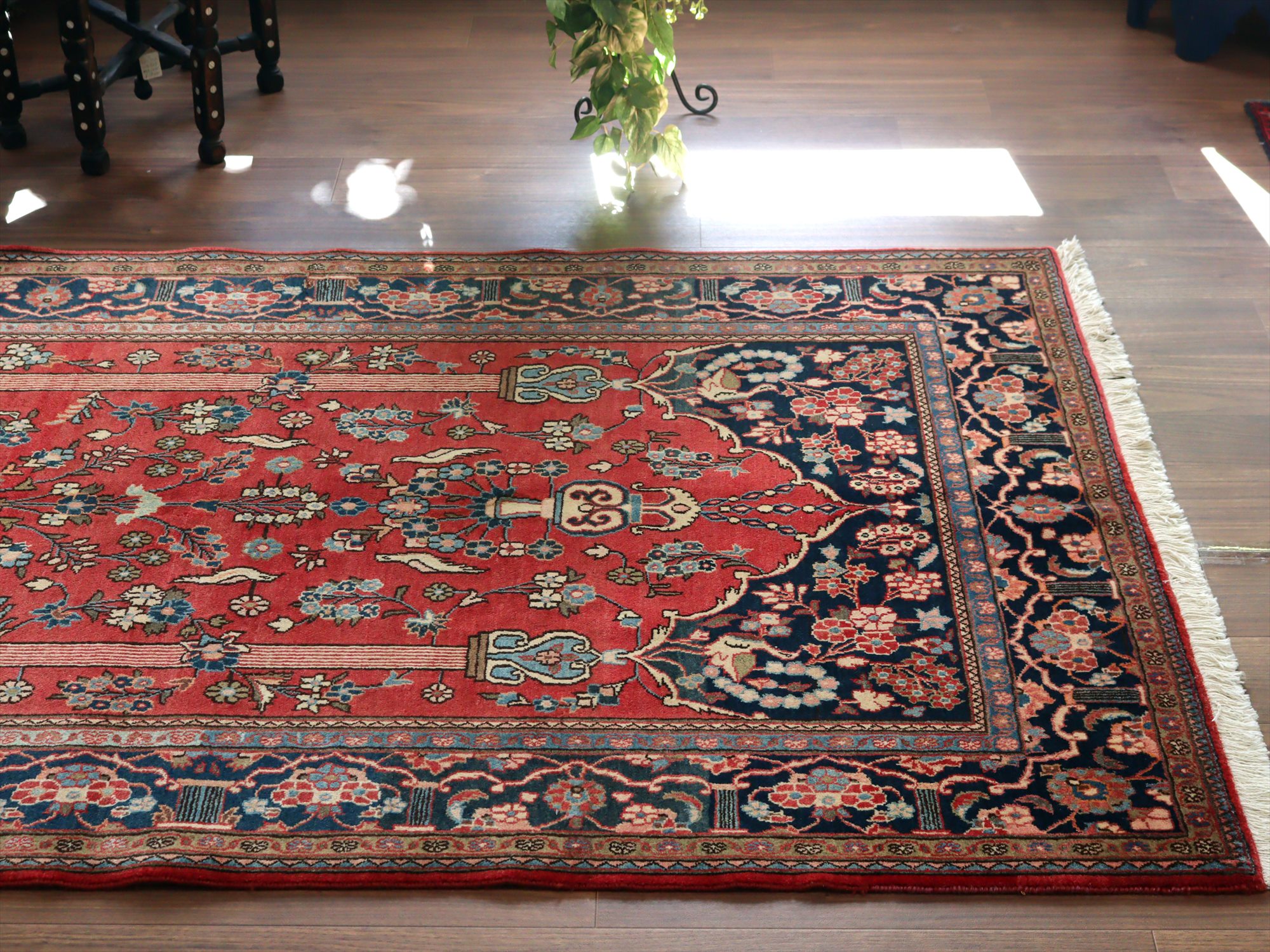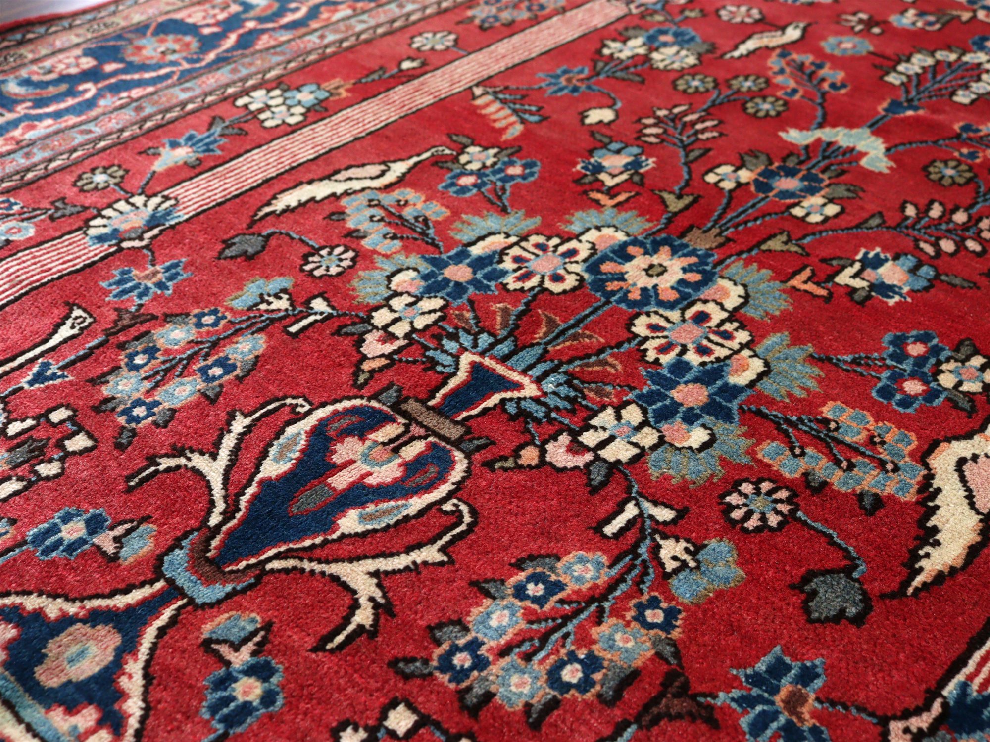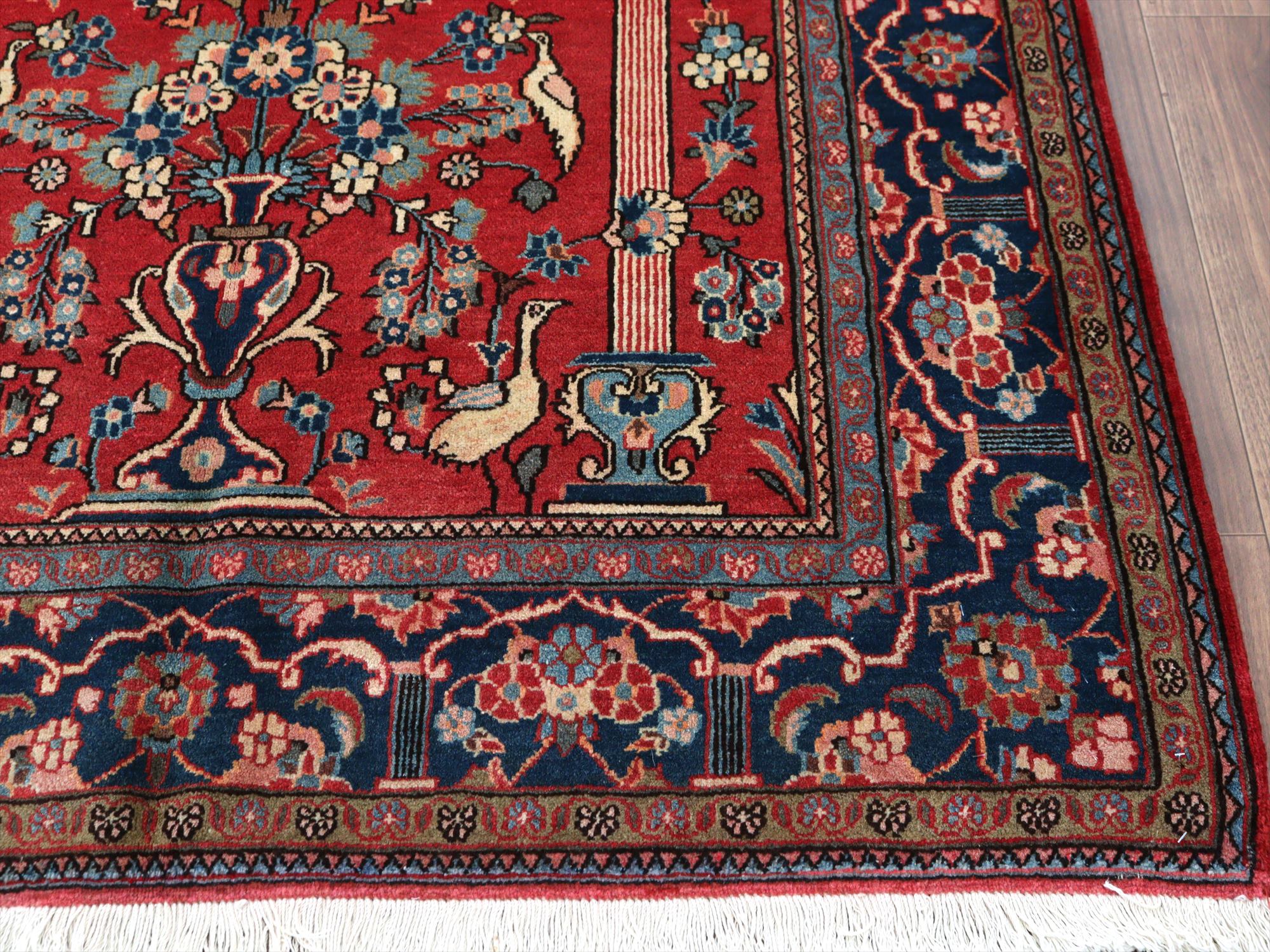 美しい曲線で描いたデザインが特長的なカシャーンの絨毯。細かな織りで、鳥や花、それにミフラープが優雅で上品に表現されています。抑えた朱赤と、額縁のネイビーの丁度よいトーンバランスがデザインの美しさを引き立てます。