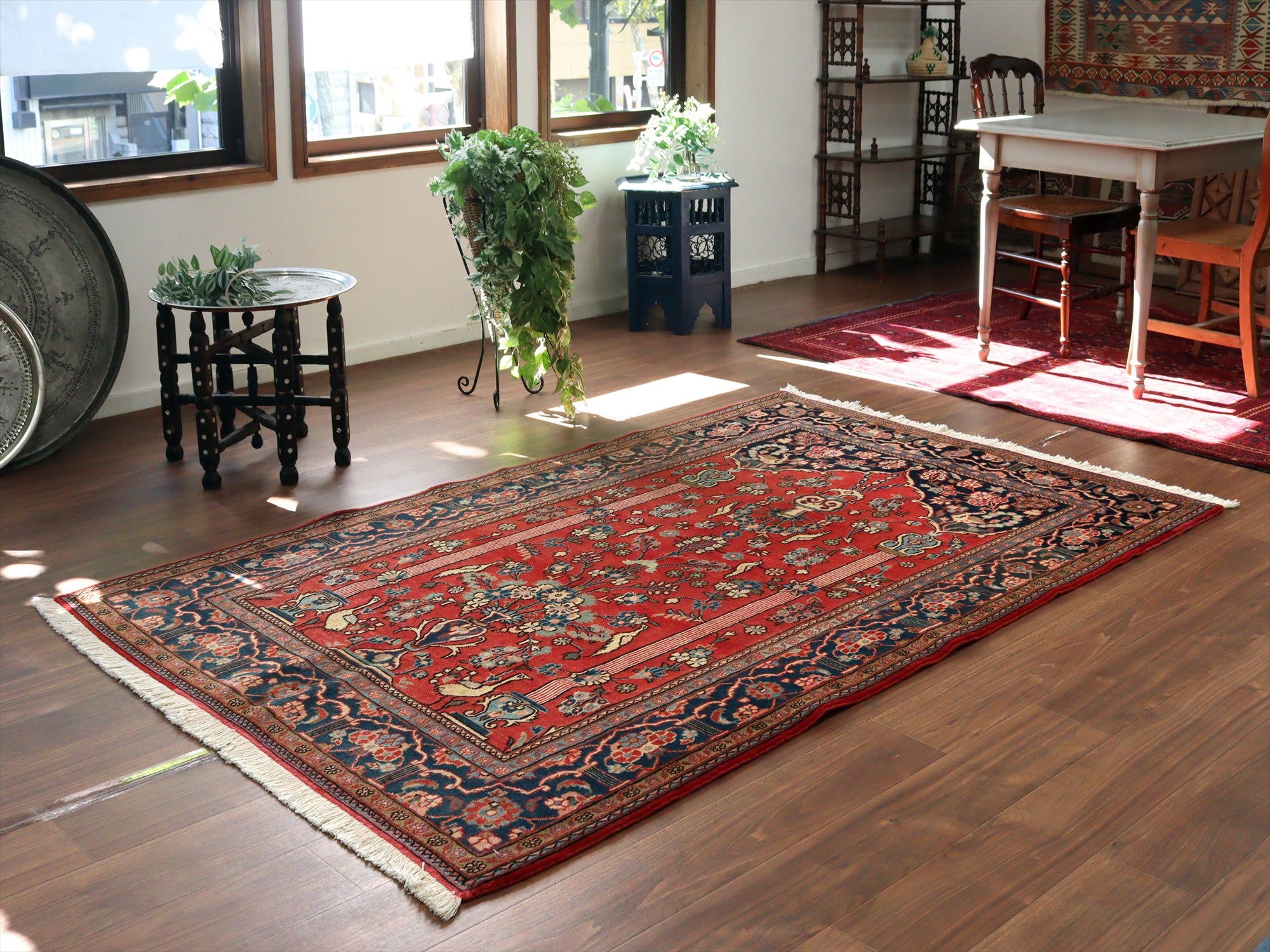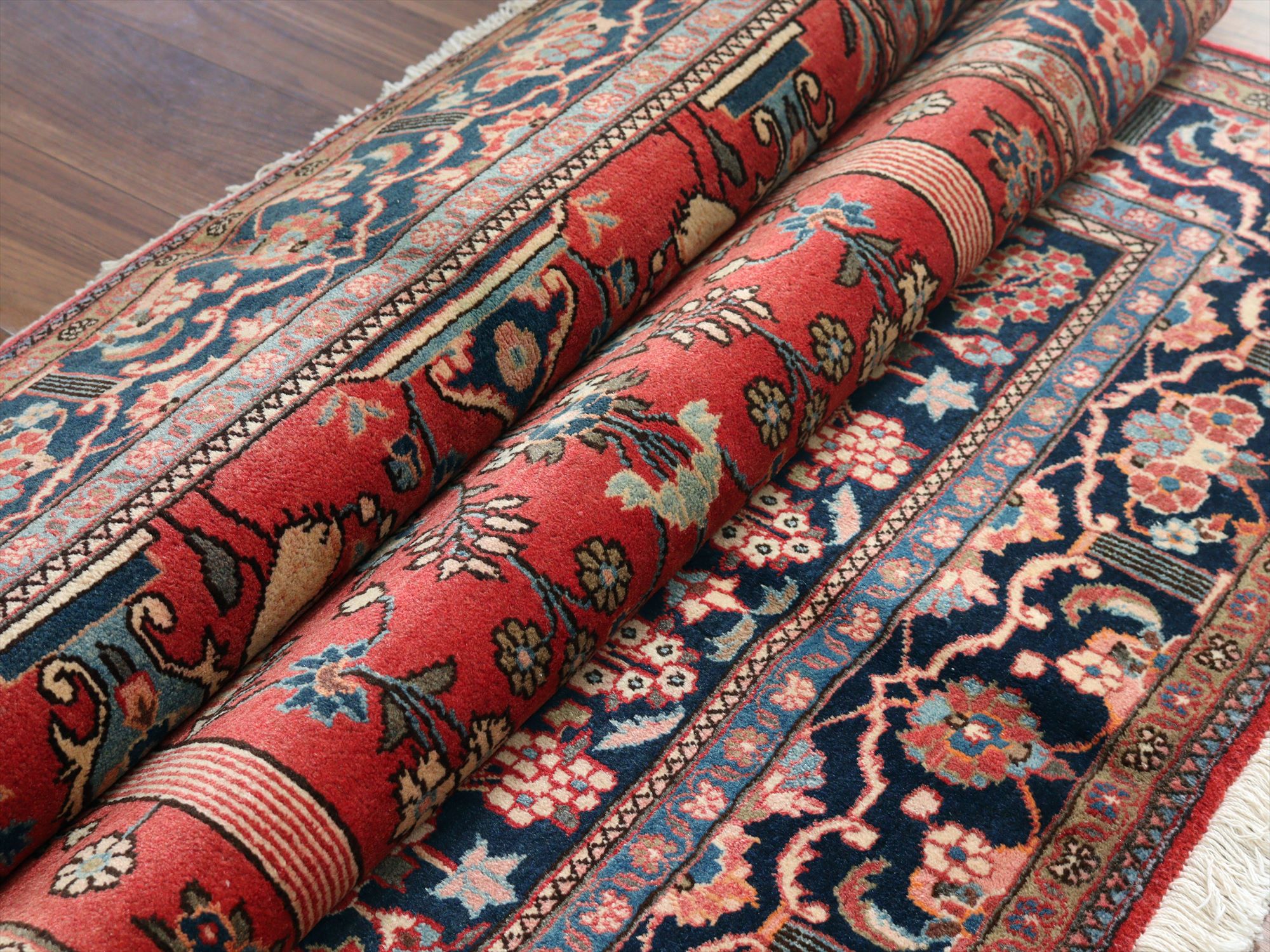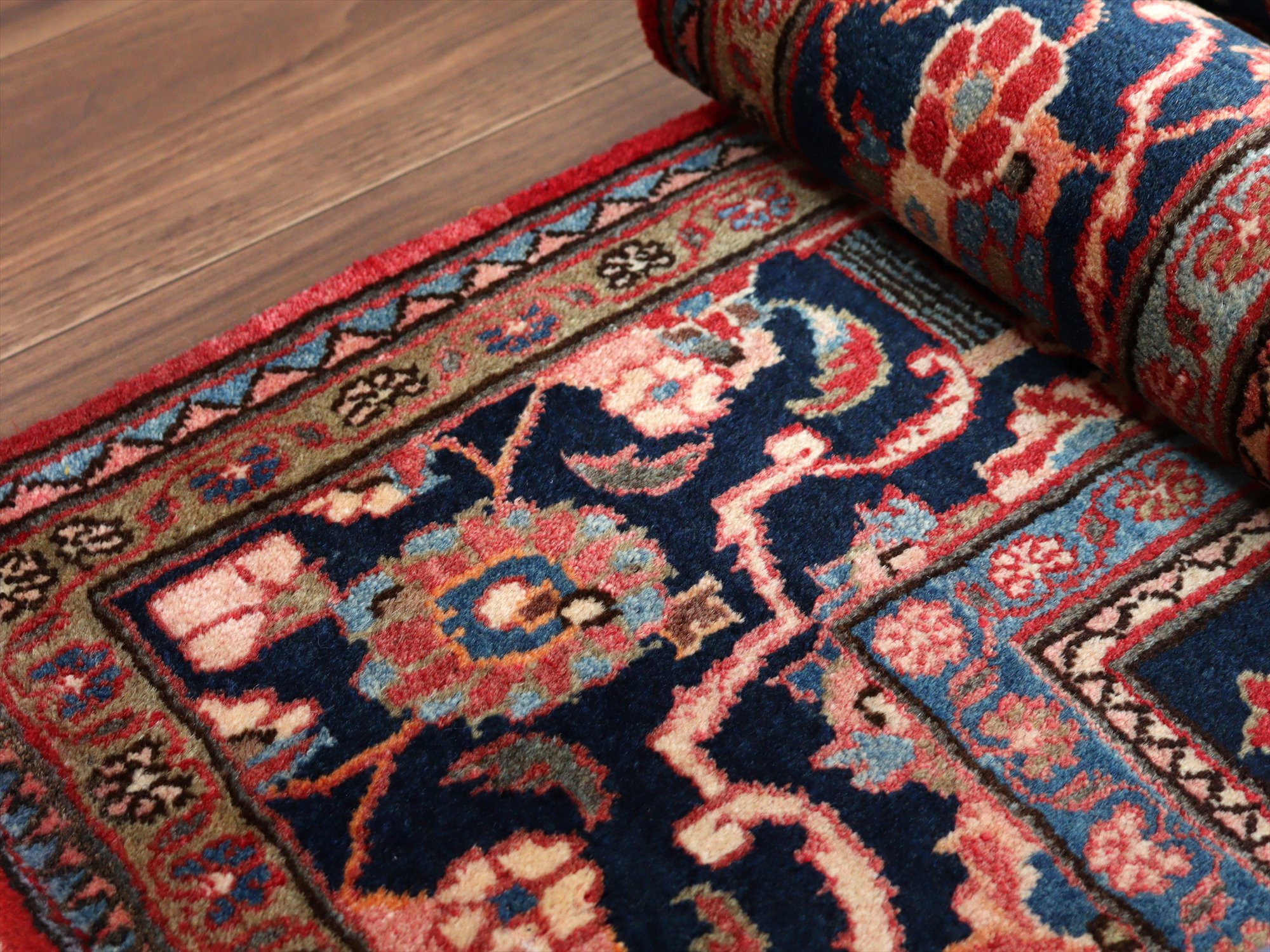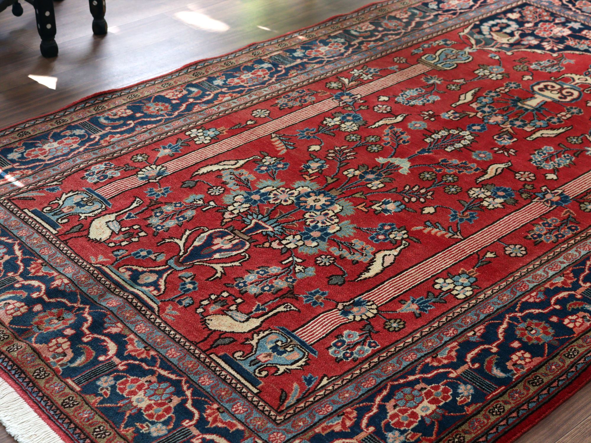 美しい曲線で描いたデザインが特長的なカシャーンの絨毯。細かな織りで、鳥や花、それにミフラープが優雅で上品に表現されています。抑えた朱赤と、額縁のネイビーの丁度よいトーンバランスがデザインの美しさを引き立てます。