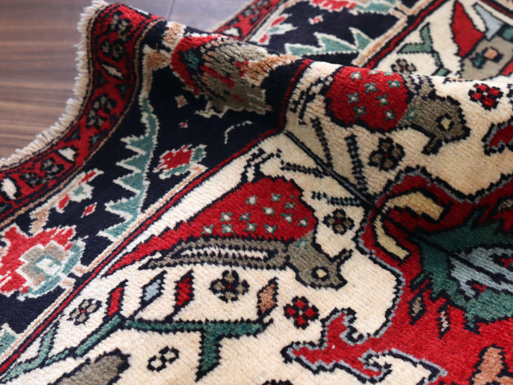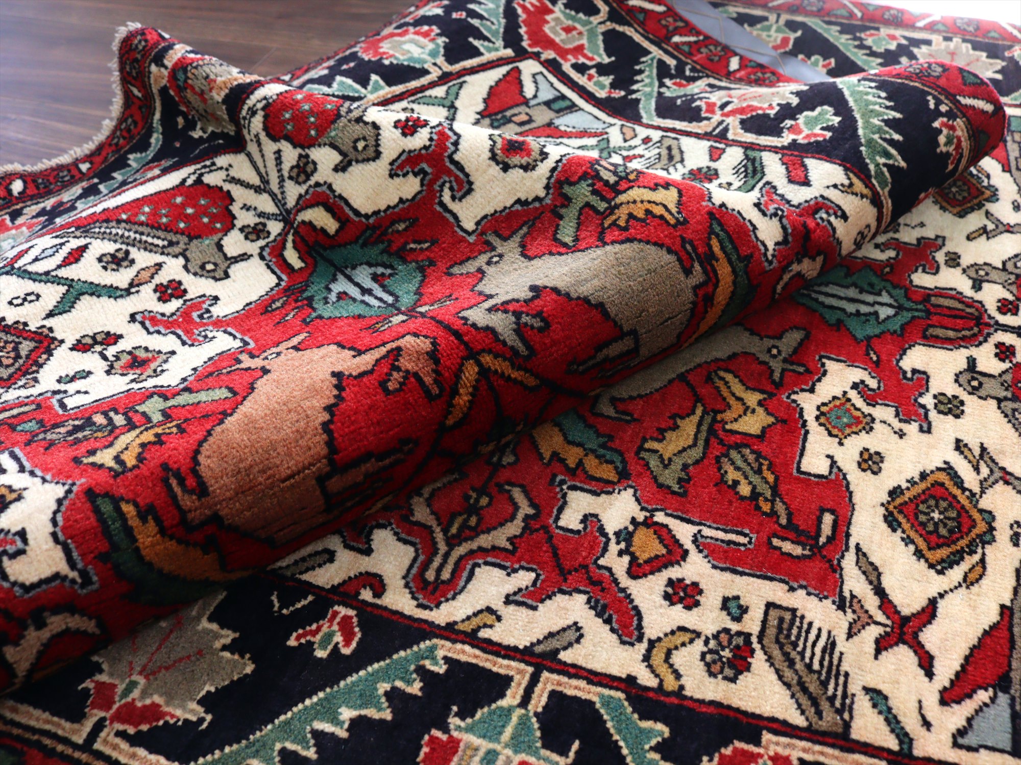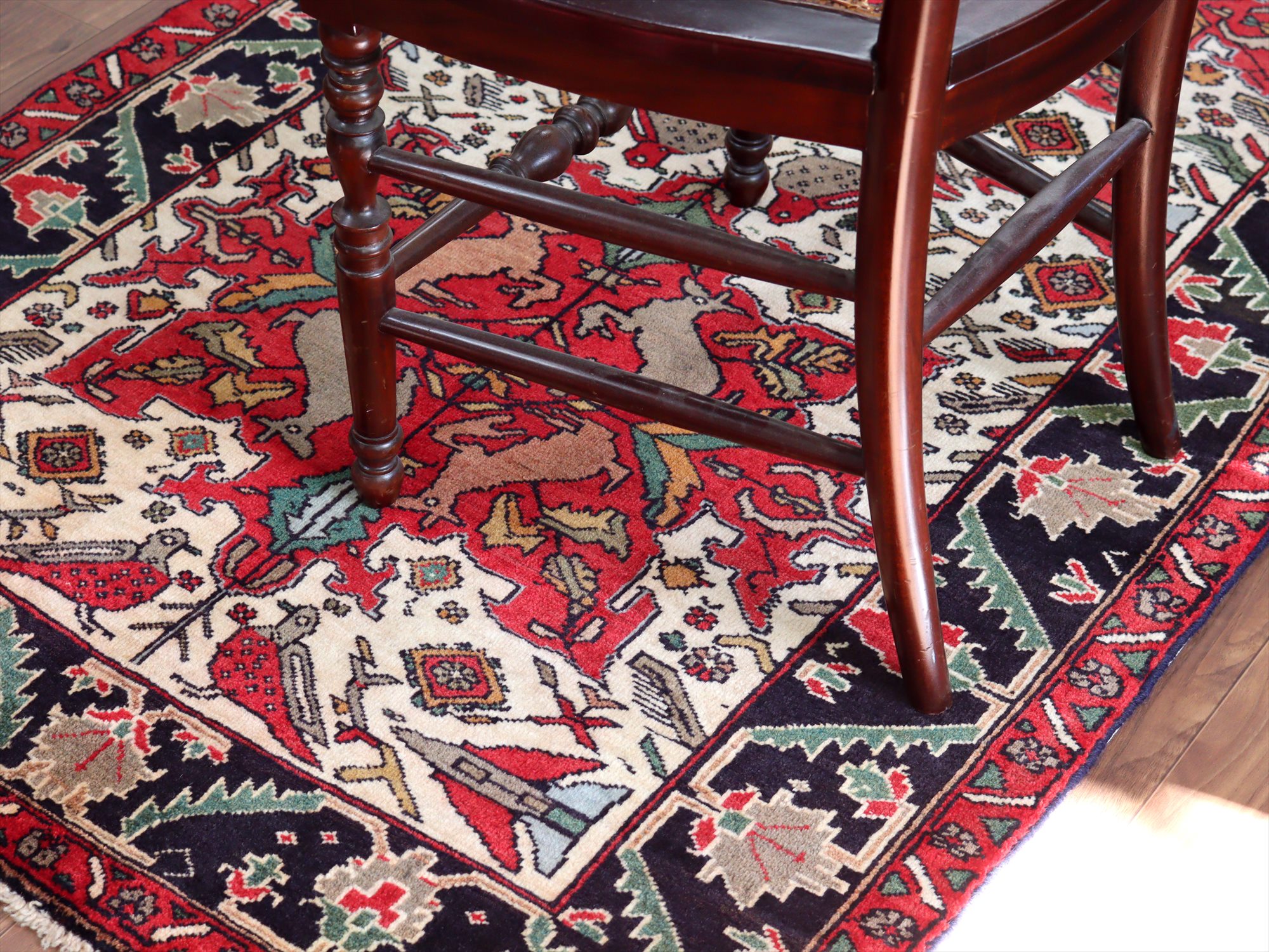 センターはアイボリーベースに動物が織られた花形のメダリオン、額縁部分にはネイビーに花が連なるように織られたデザイン。鳥もデザインに馴染むように織られているようです。