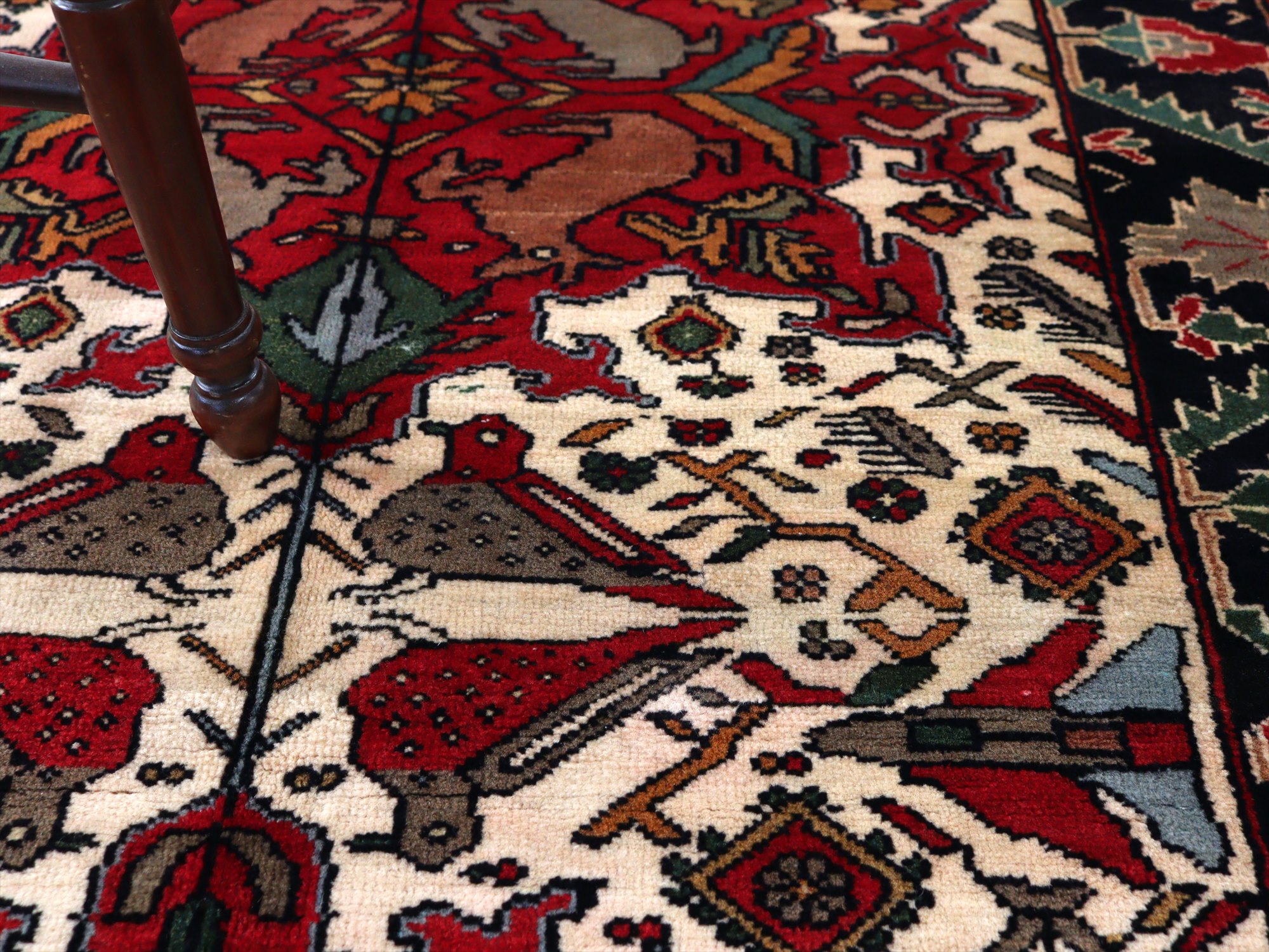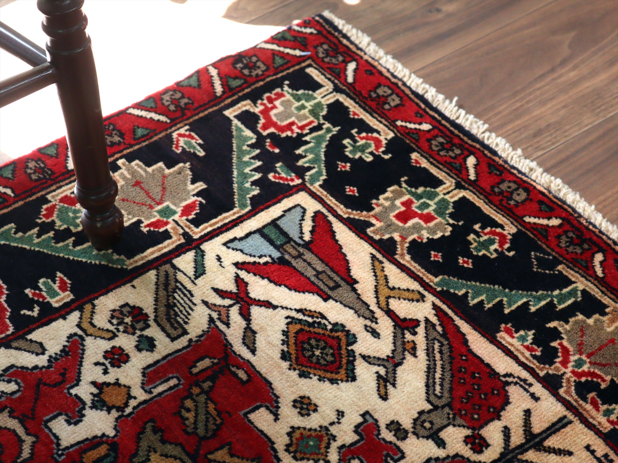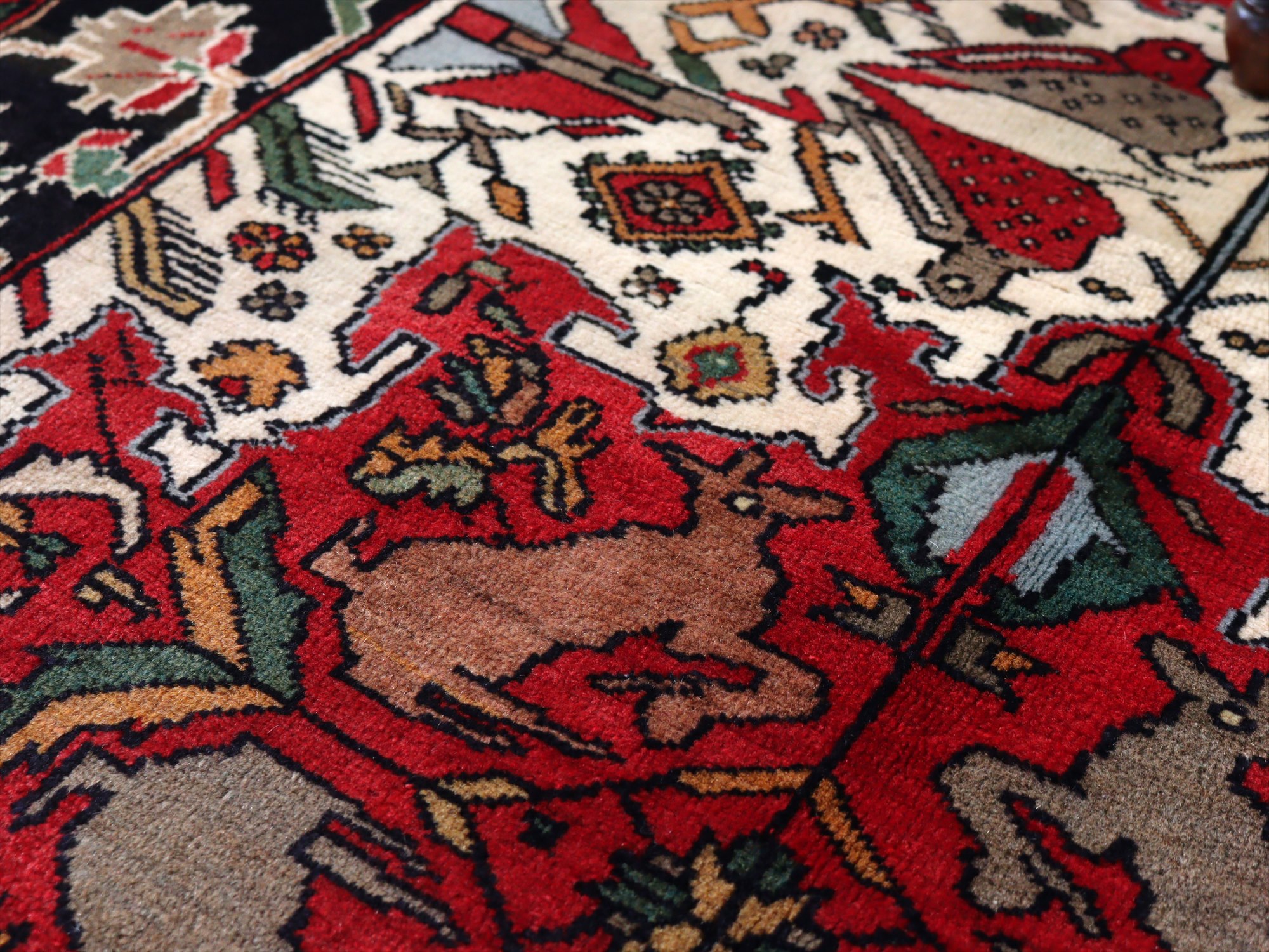 センターはアイボリーベースに動物が織られた花形のメダリオン、額縁部分にはネイビーに花が連なるように織られたデザイン。鳥もデザインに馴染むように織られているようです。
