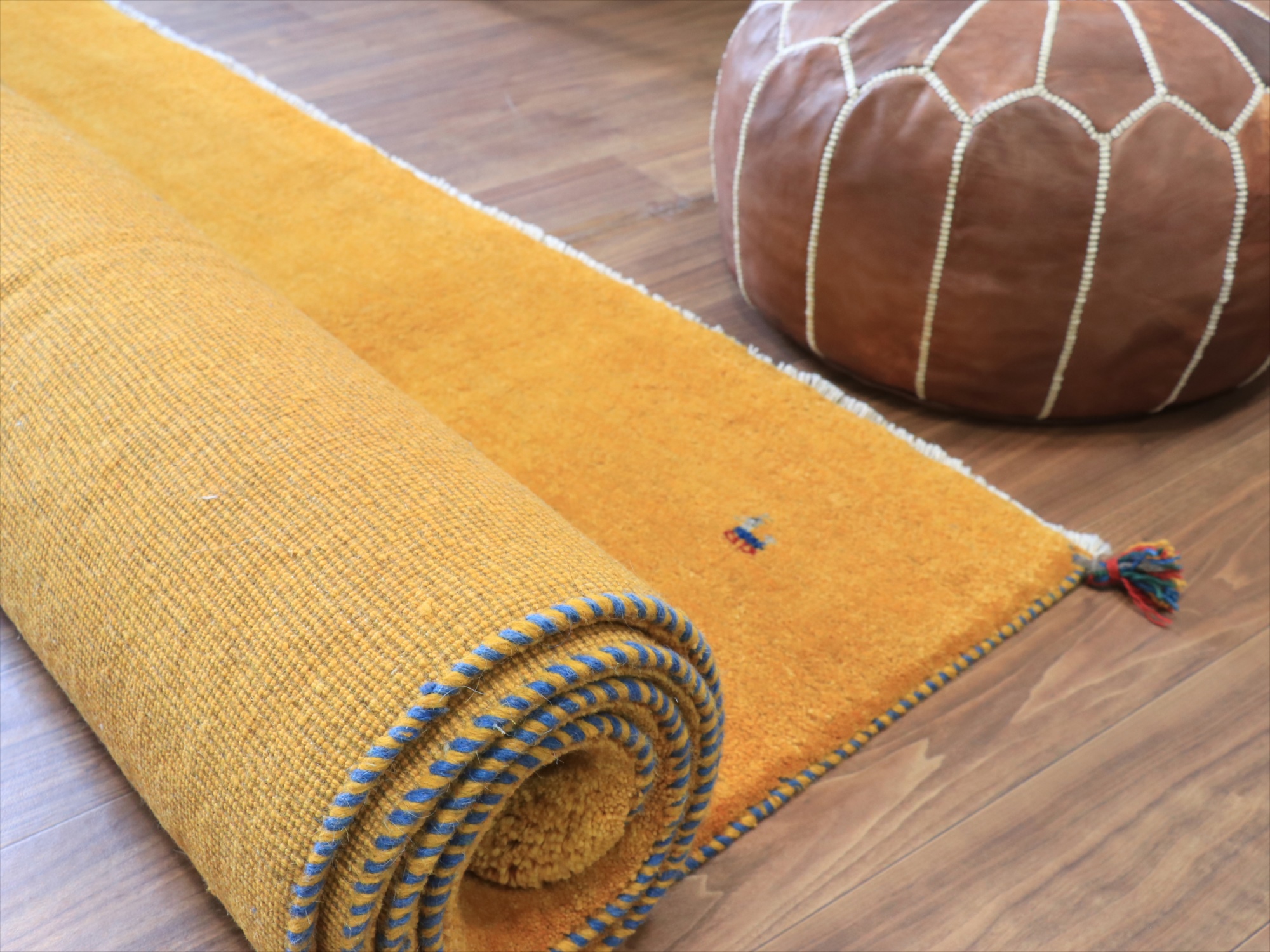 手で紡いだ毛糸を、天然の染料で染め上げ、丁寧に織り込まれた伝統的なギャッベです。イエロー系の染めは、ウコン(ターメリック)、ジャシール、ザクロの皮、クチナシなどが使われます。きれいな黄色のギャッベにするために大切なのは、染める前の毛糸の選別作業。グレーやブラウンが多く混ざっているウールを染めると、マダラ模様のある黄色になってしまうので、明るいアイボリー部分だけをより分けて黄色に染めてゆくのです。