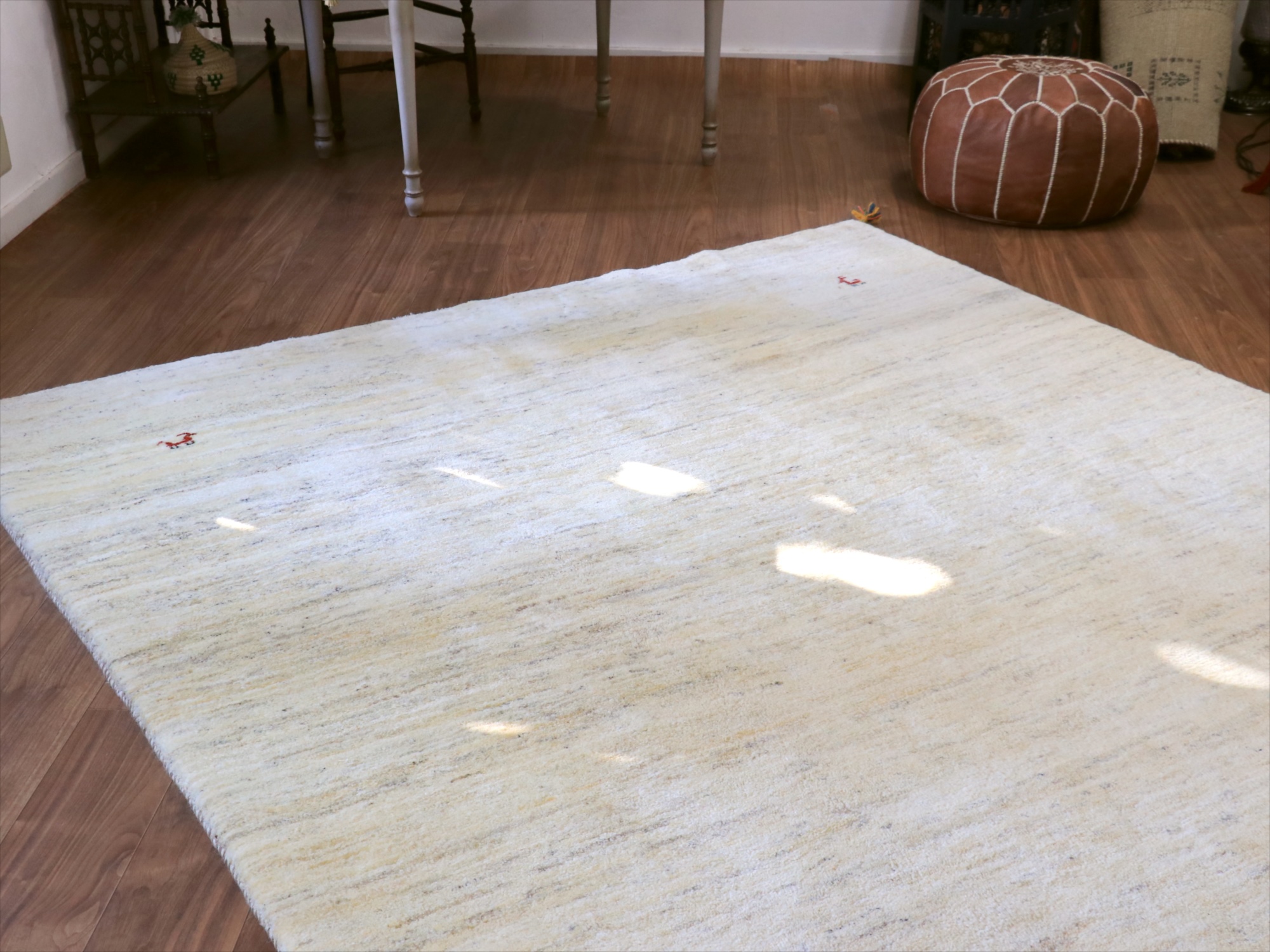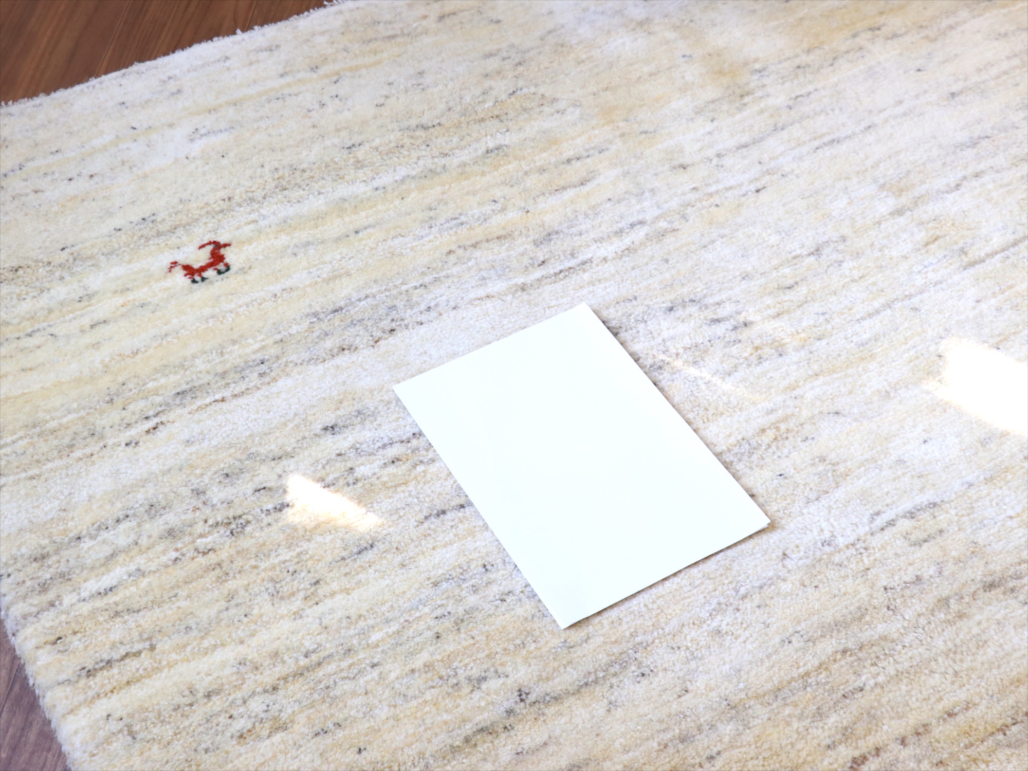 羊毛の自然な色味を活かして織られたシンプルデザインのギャッベ。当店ではナチュラルアイボリーと表記していいます。いわゆる白い羊の色ですが、真っ白ではなく、黄色みのあるベージュがベースになっています。参考になるように、白いコピー用紙を一緒に撮影しました。このピースは、全体的に、羊毛のグレーやベージュが混ざっていて、自然な感じの色ムラができています。正面から見て、左上のほうはグレーっぽい毛糸が少し多めに混ざっています。