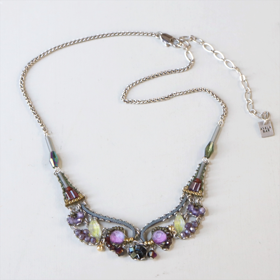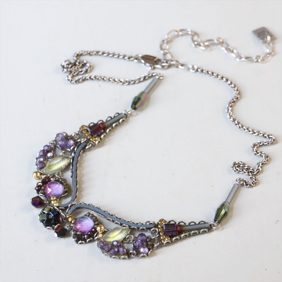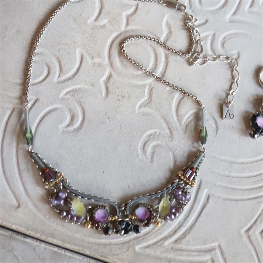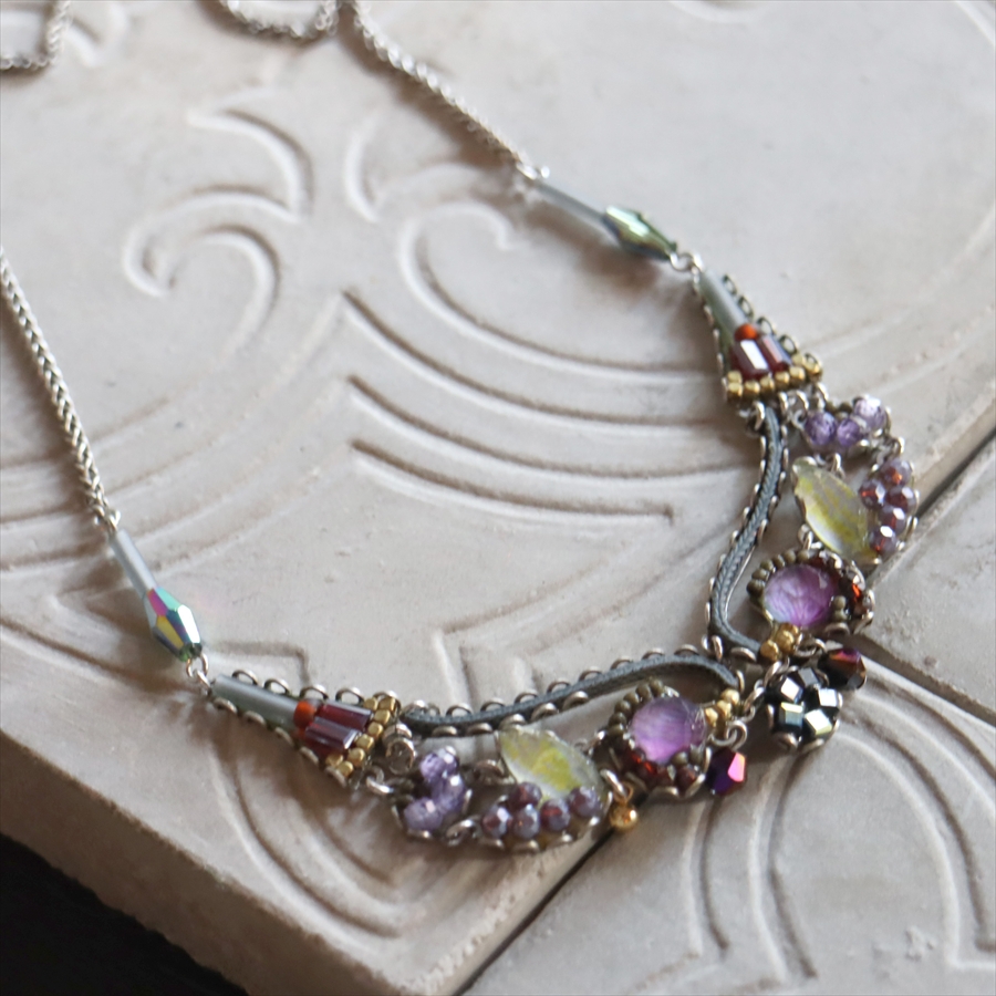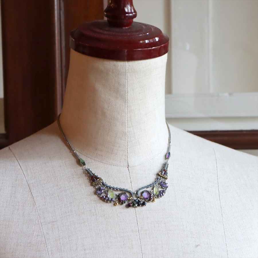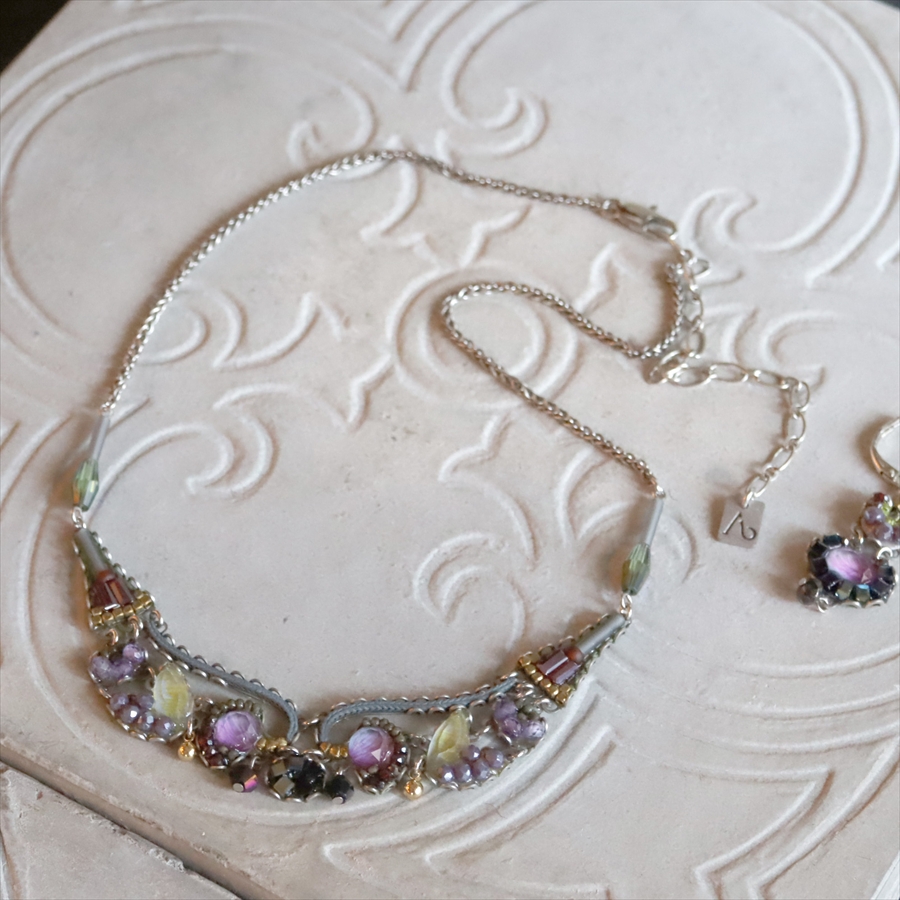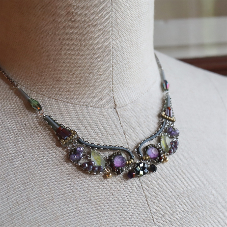 深みあるインディゴとパープルのミステリアスな雰囲気のSilent Shadowsという名のシリーズ。ライムグリーンがアクセントになった華奢でエレガントなネックレスです。