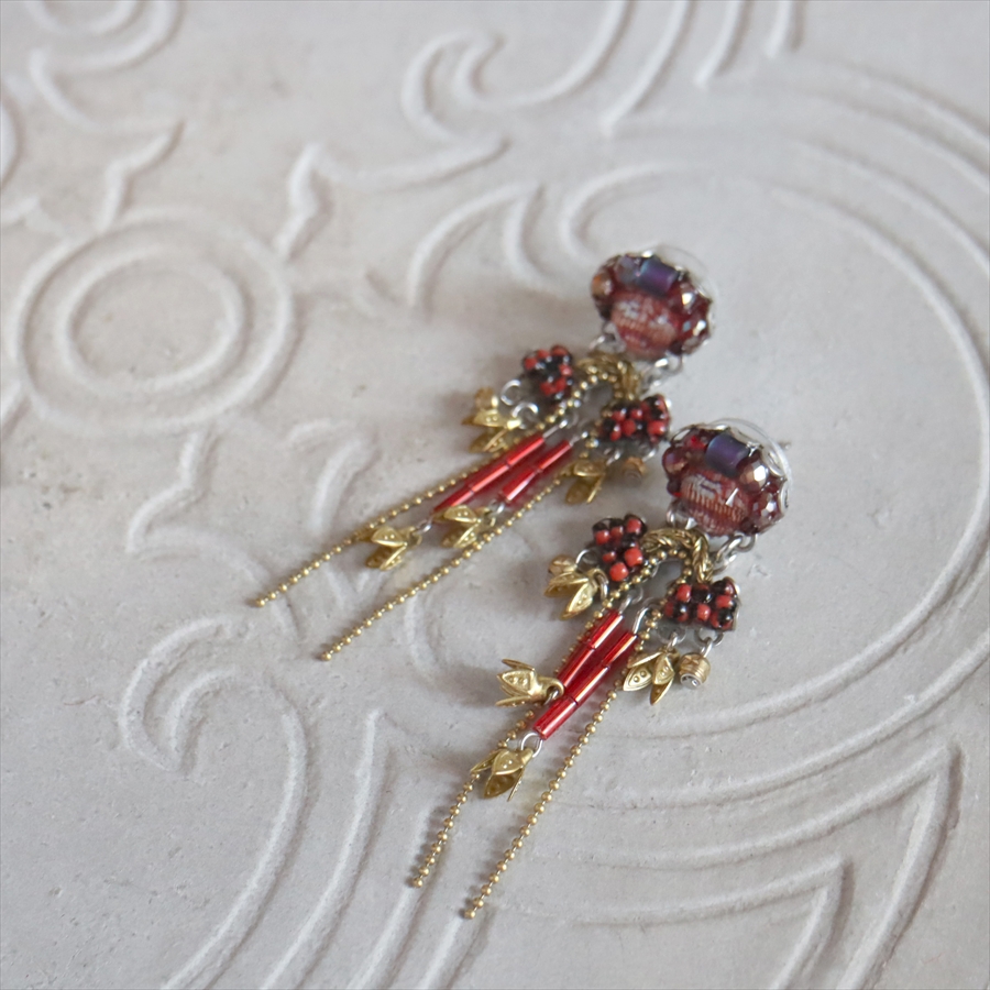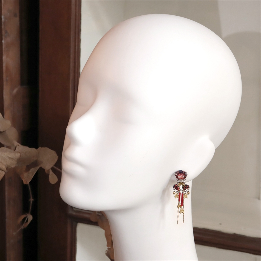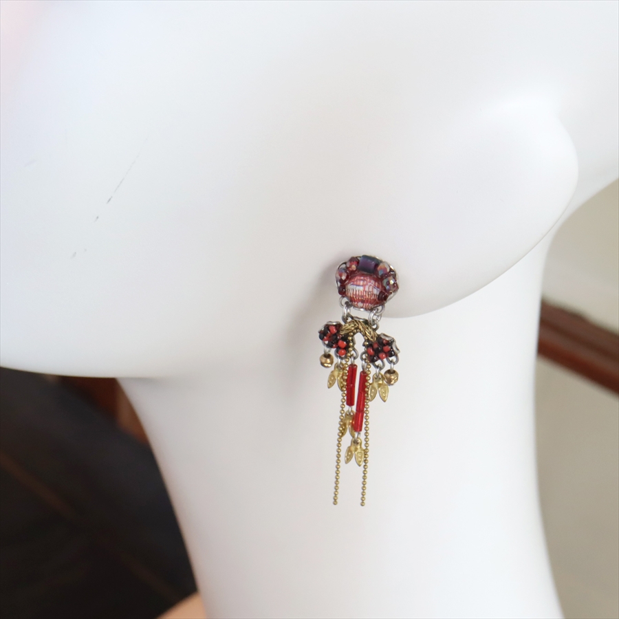 深みあるバーガンディ、プラムのようなカラーが印象的な大人の気品が漂う魅力のNoble Wineという名のシリーズ。メタリックの深紅のビーズとゴールドチェーンが耳元で揺れるピアスです。