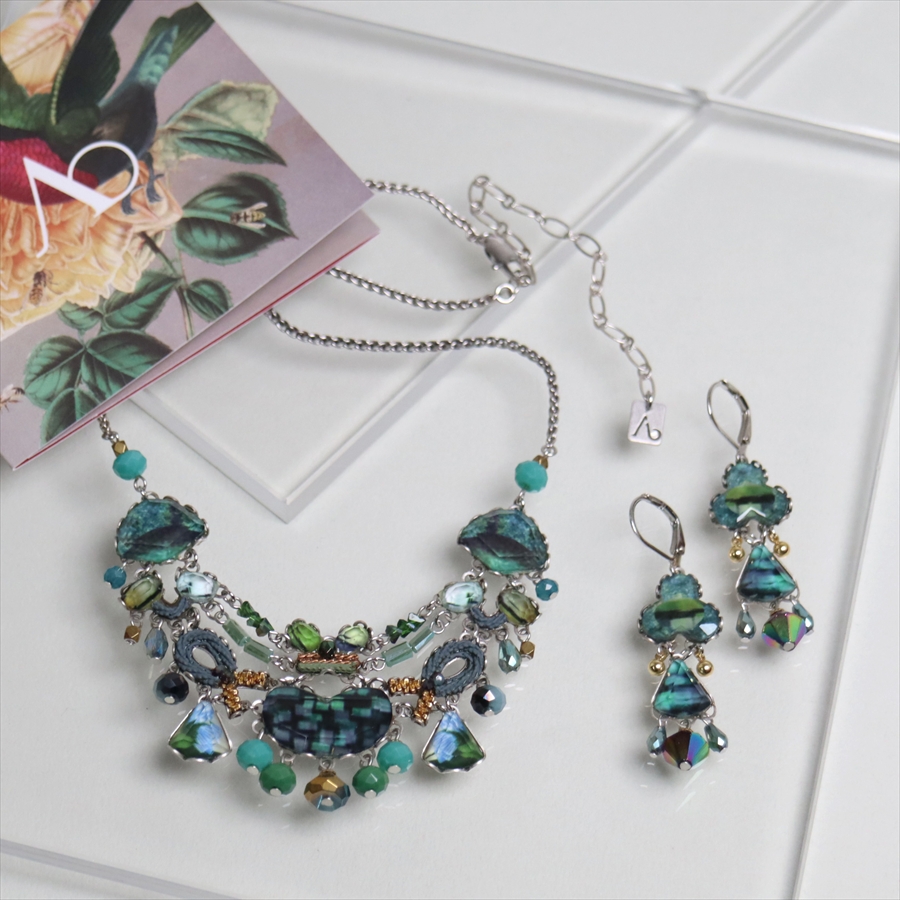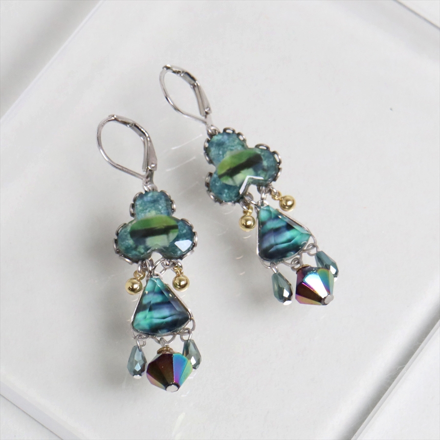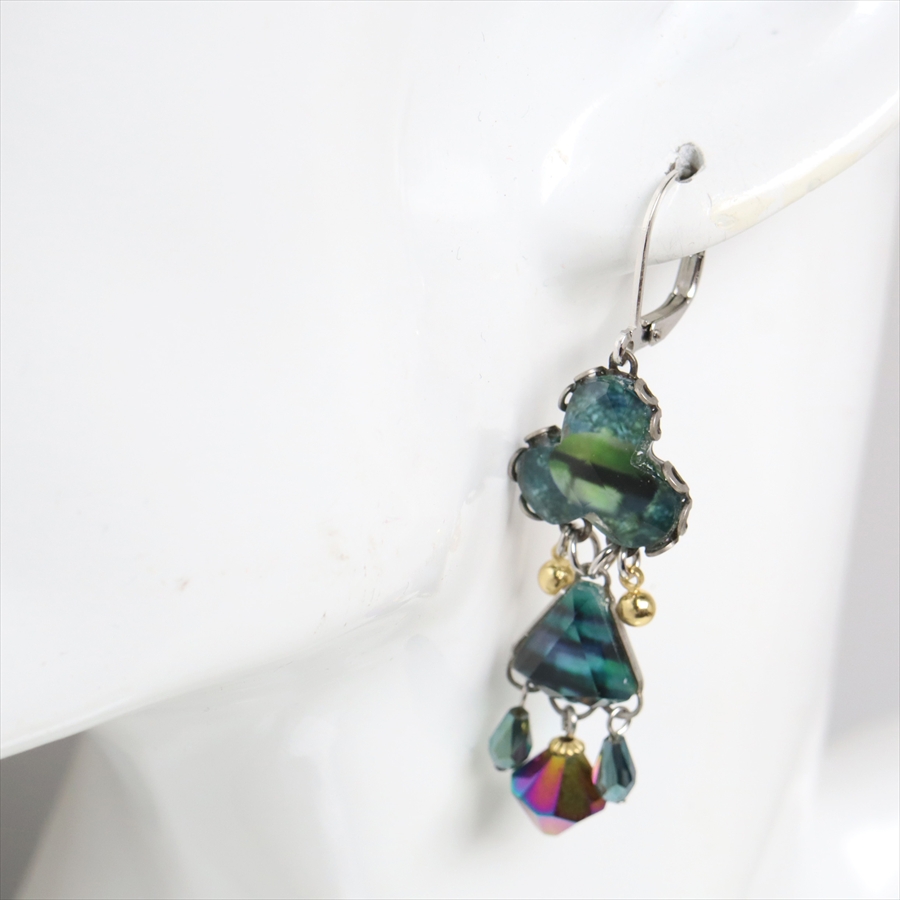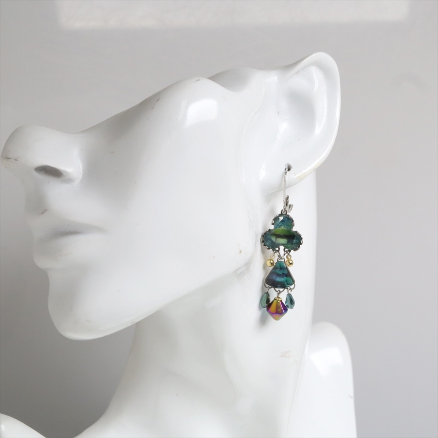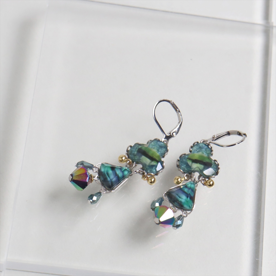 青みある深いグリーンが光を受けて、ガラスビーズに反射し優し気に輝く、Emerald Reflectionという名のシリーズ。水面に映る森のような幻想的な美しさを演出しているような雰囲気のピアスです。