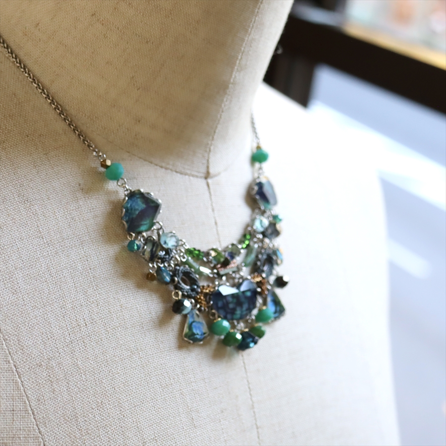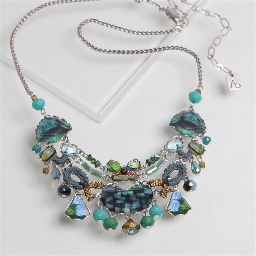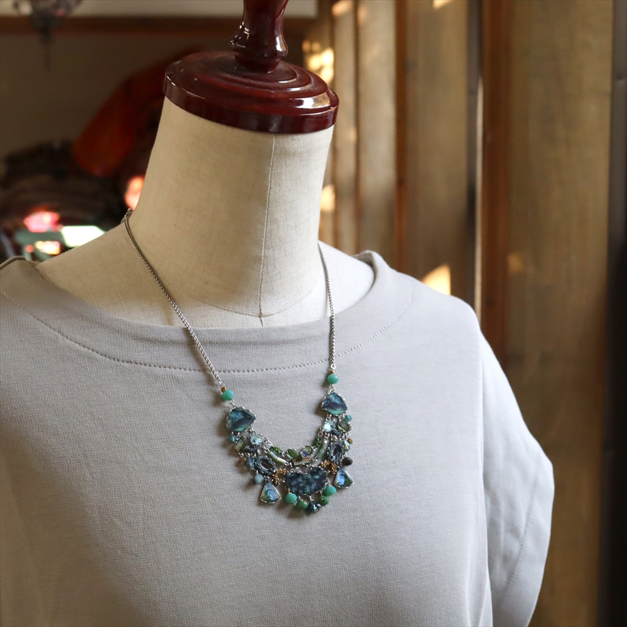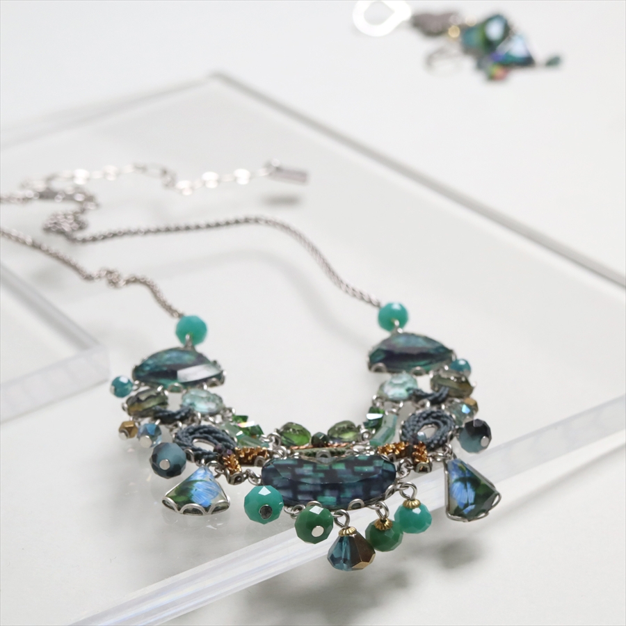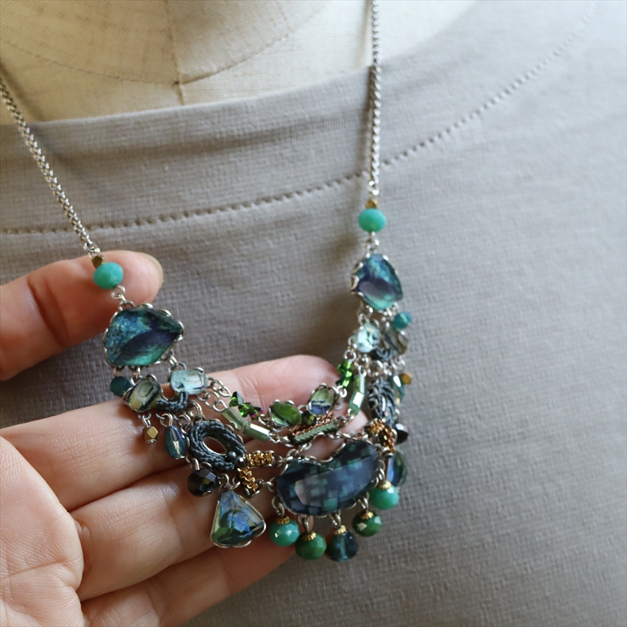 青みある深いグリーンが光を受けて、ガラスビーズに反射し優し気に輝く、Emerald Reflectionという名のシリーズ。水面に映る森のような幻想的な美しさを演出しているような雰囲気のネックレスです。
