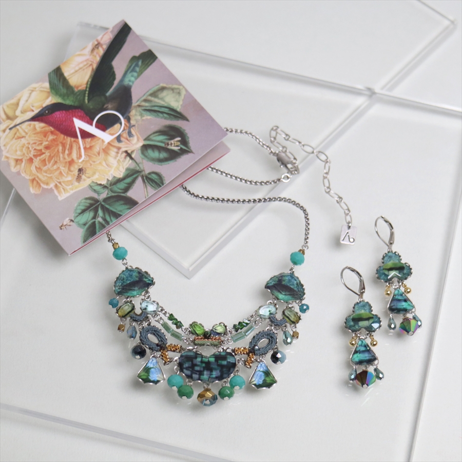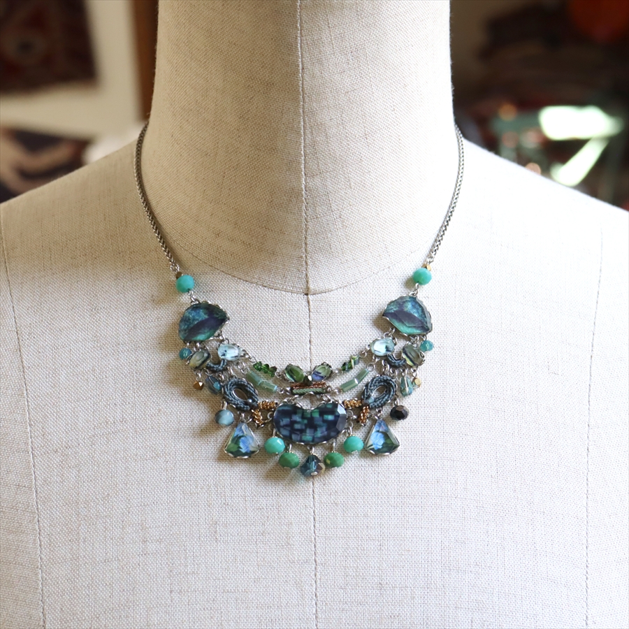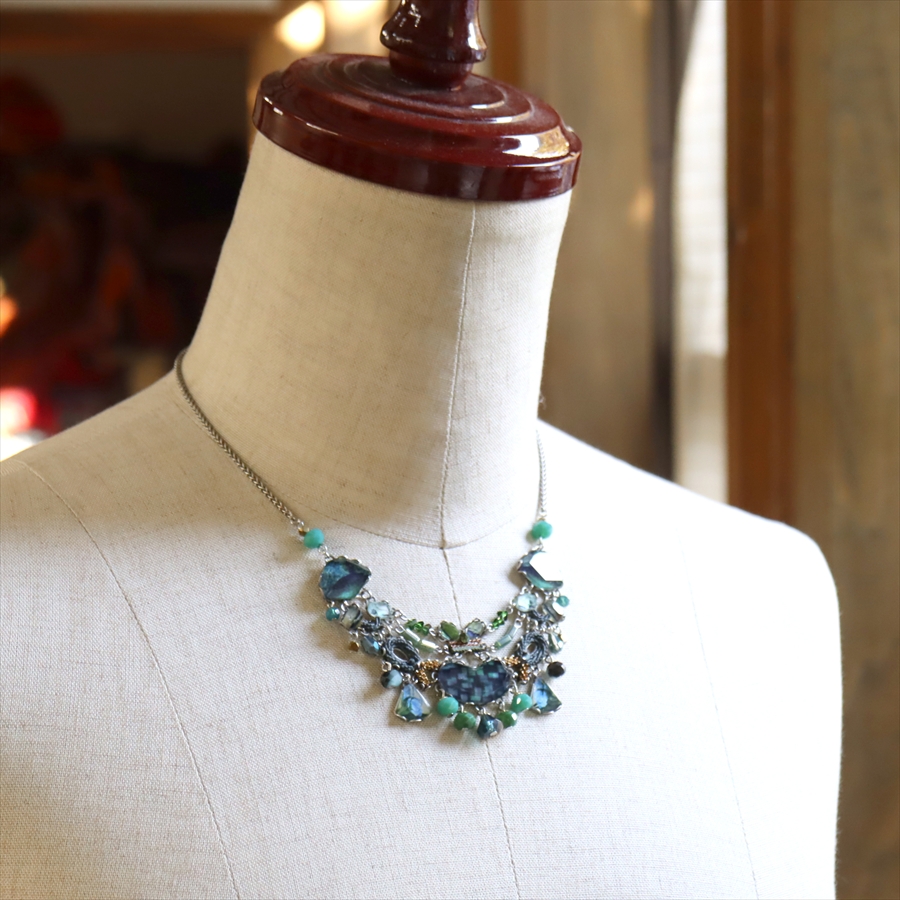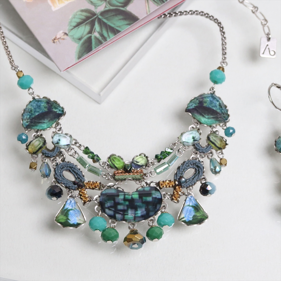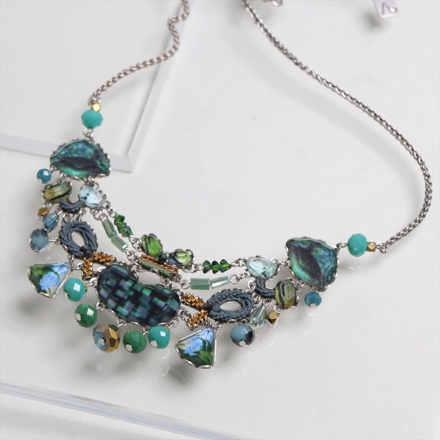 青みある深いグリーンが光を受けて、ガラスビーズに反射し優し気に輝く、Emerald Reflectionという名のシリーズ。水面に映る森のような幻想的な美しさを演出しているような雰囲気のネックレスです。