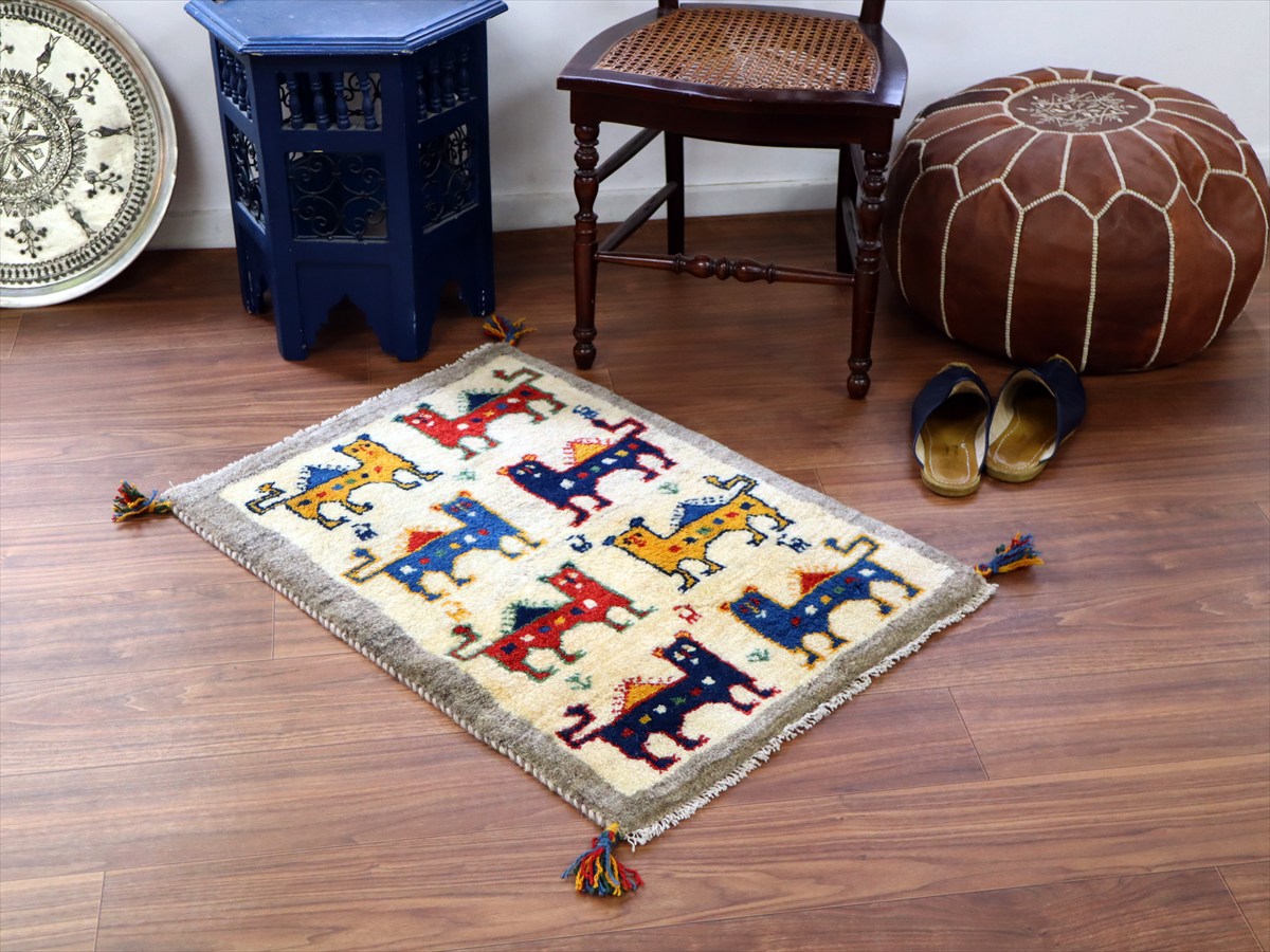 ギャッベ イラン産手織り 86×62cm 玄関マット ナチュラルアイボリー カラフルなライオン