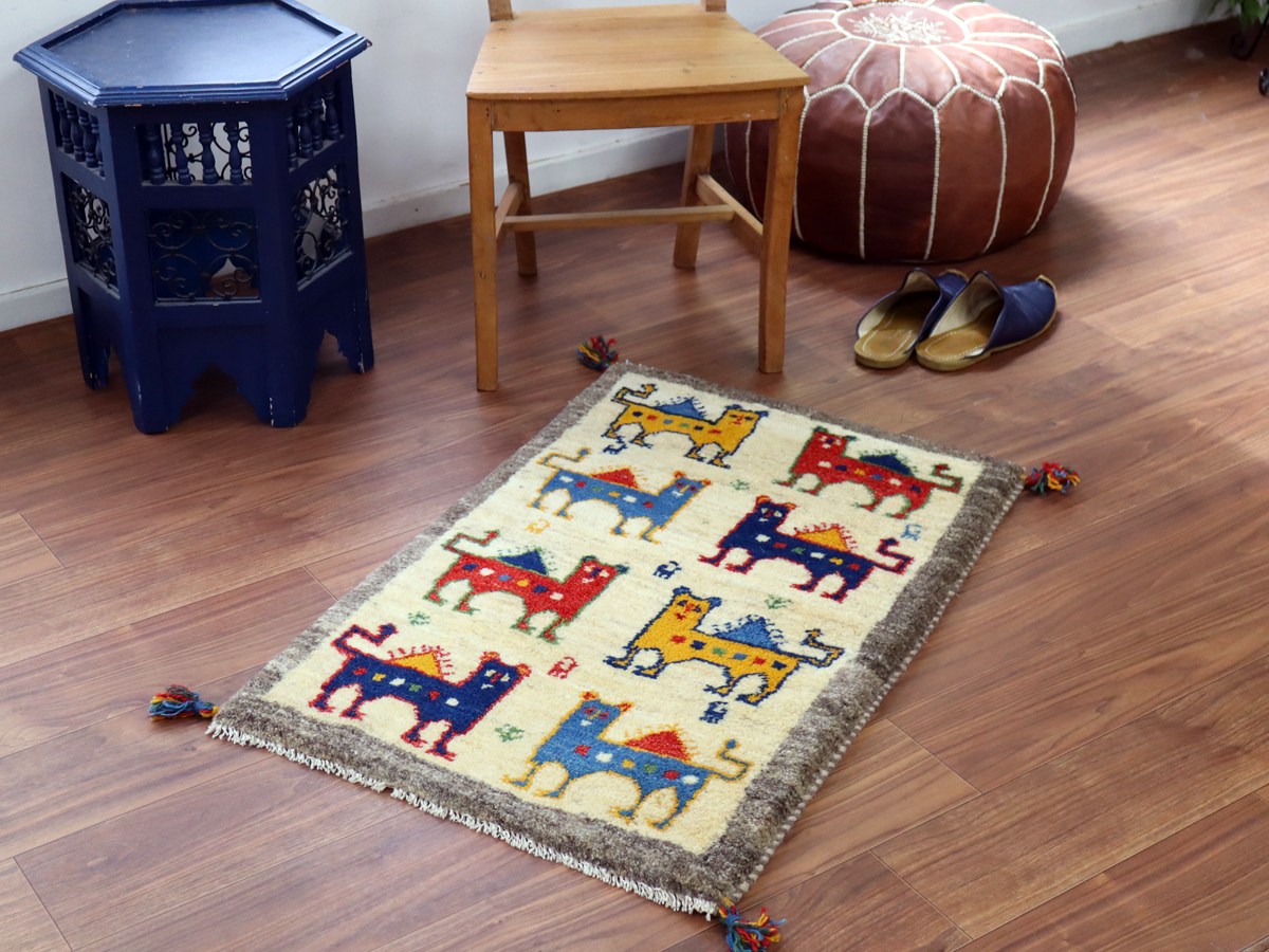 - ギャッベ イラン産手織り 92×62cm 玄関マット ナチュラルアイボリー カラフルなライオン
