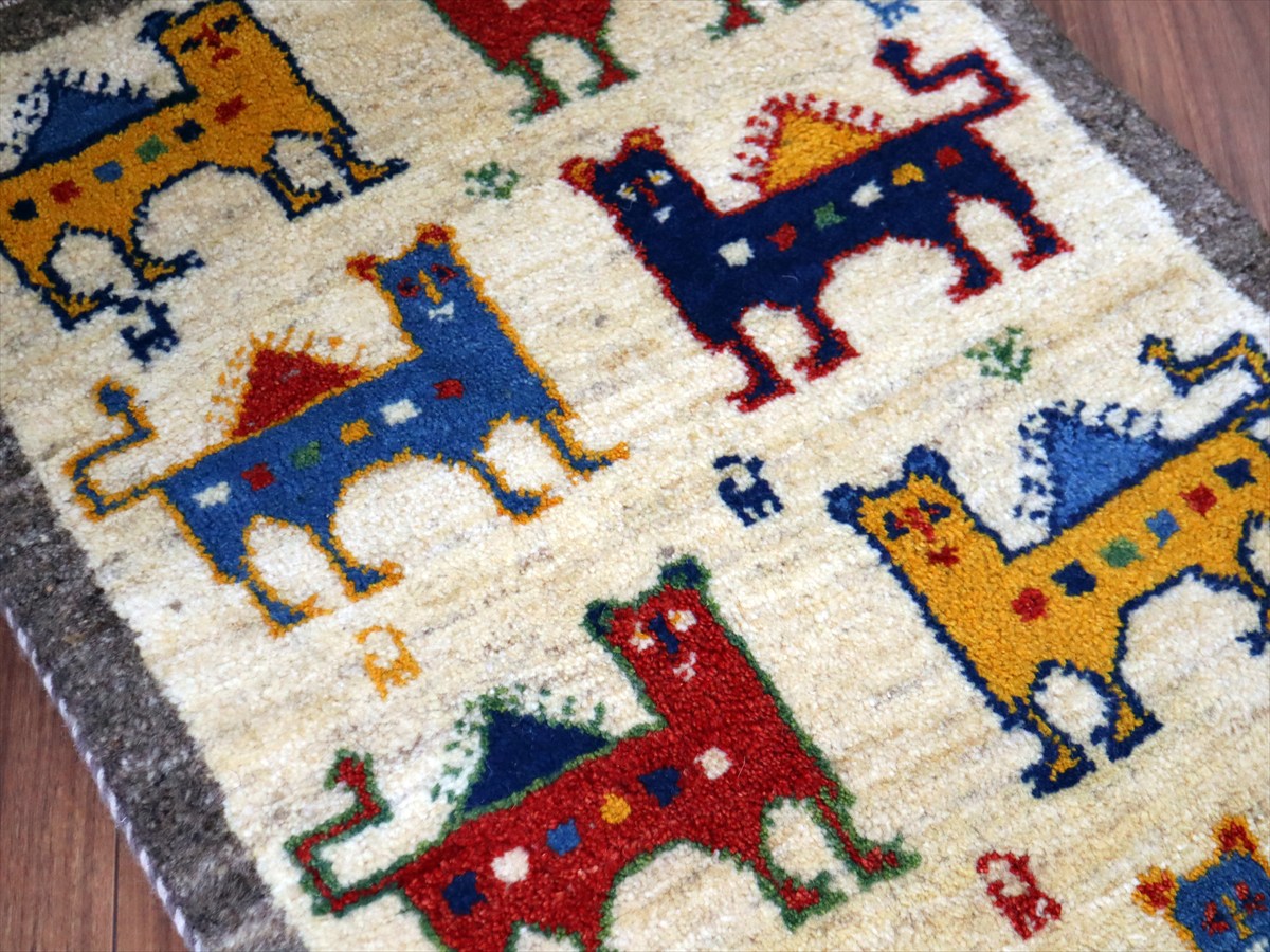 ギャッベ イラン産手織り 92×62cm 玄関マット ナチュラルアイボリー カラフルなライオン