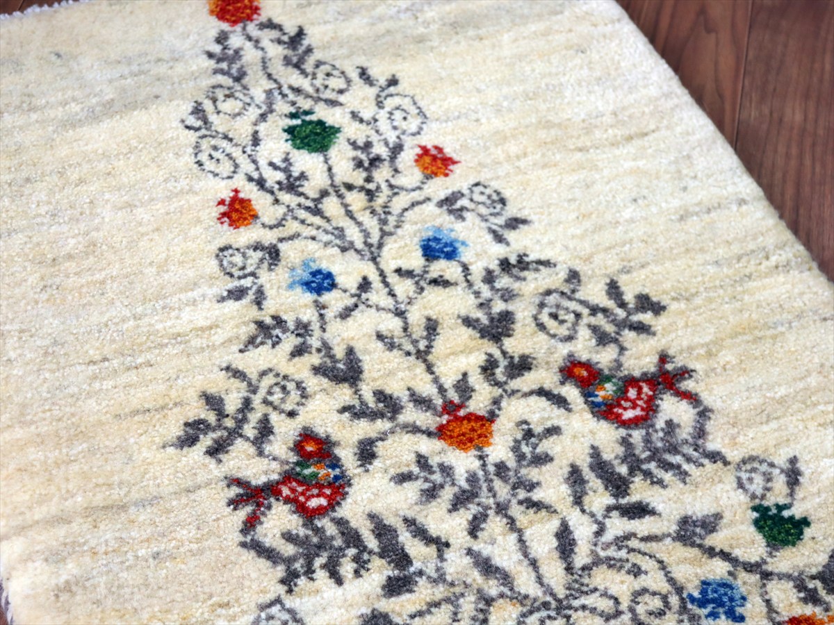 ギャッベ イラン産手織り 91×65cm 玄関マット ナチュラルアイボリー 生命の樹と鳥とザクロ