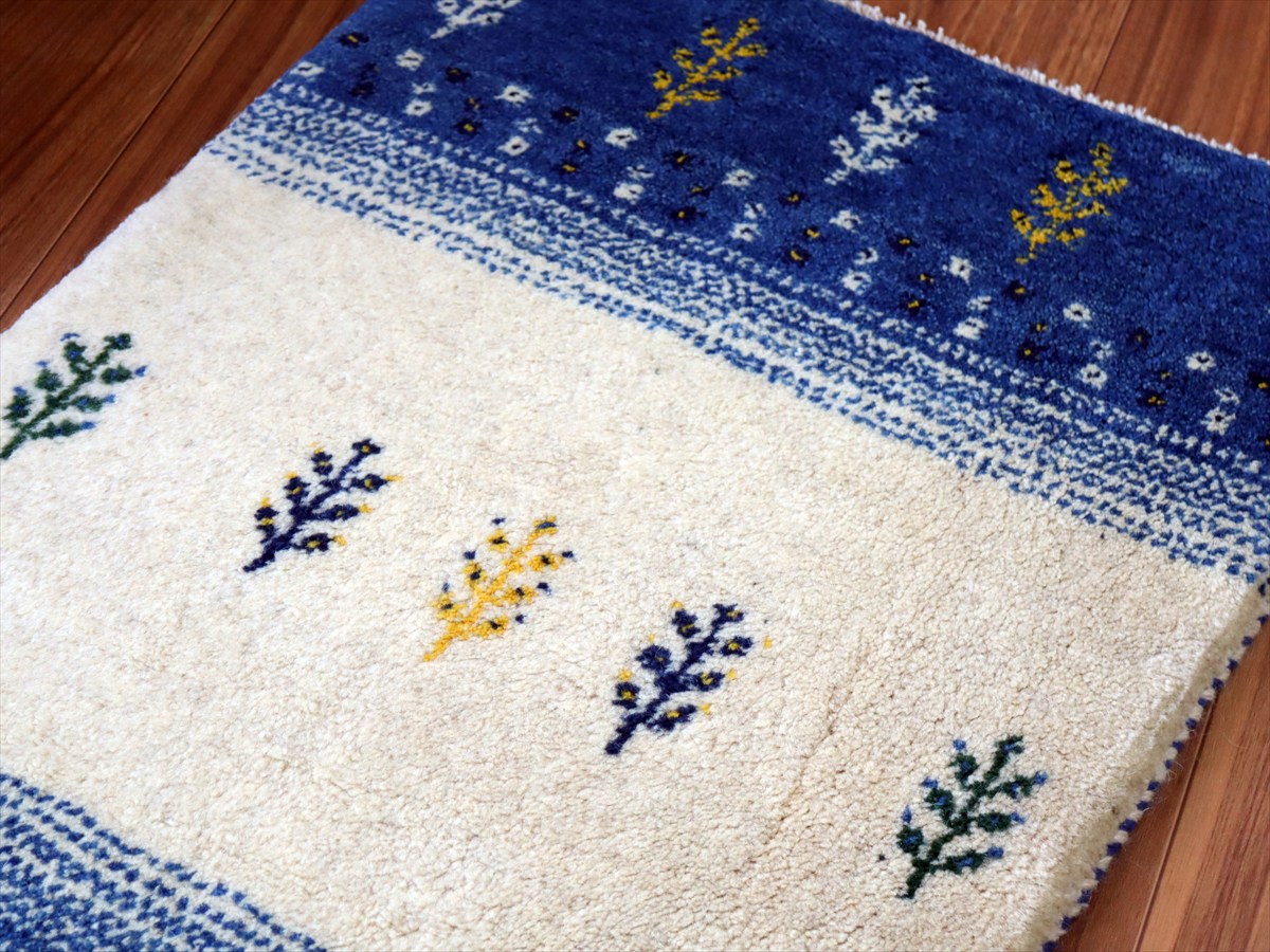 - 【15%OFF】ギャッベ イラン産手織り 87×59cm 玄関マット ナチュラルアイボリー&ブルー 生命の樹