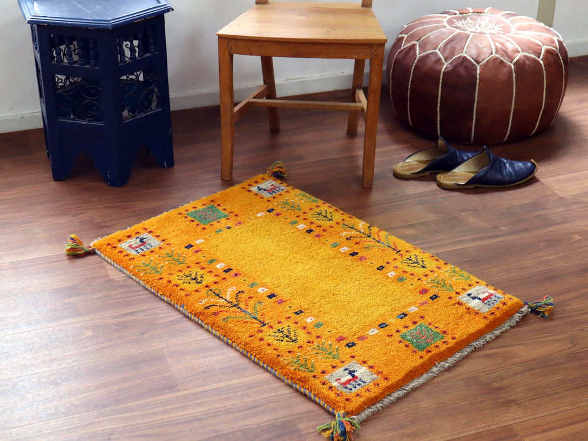 Key:Gabbeh, Tribal rug, Shiraz, Fars, Iran, Persia, Wool, ギャッベ, ふかふか, ギャベ, ラグ, 絨毯, イラン, イエロー, オレンジ 黄色 玄関マット シラーズ, ペルシャ, バザールギャッベ, ポンポン, 手織り, 草木染, 一点もの, 現品販売, 玄関マット, ガラタバザール