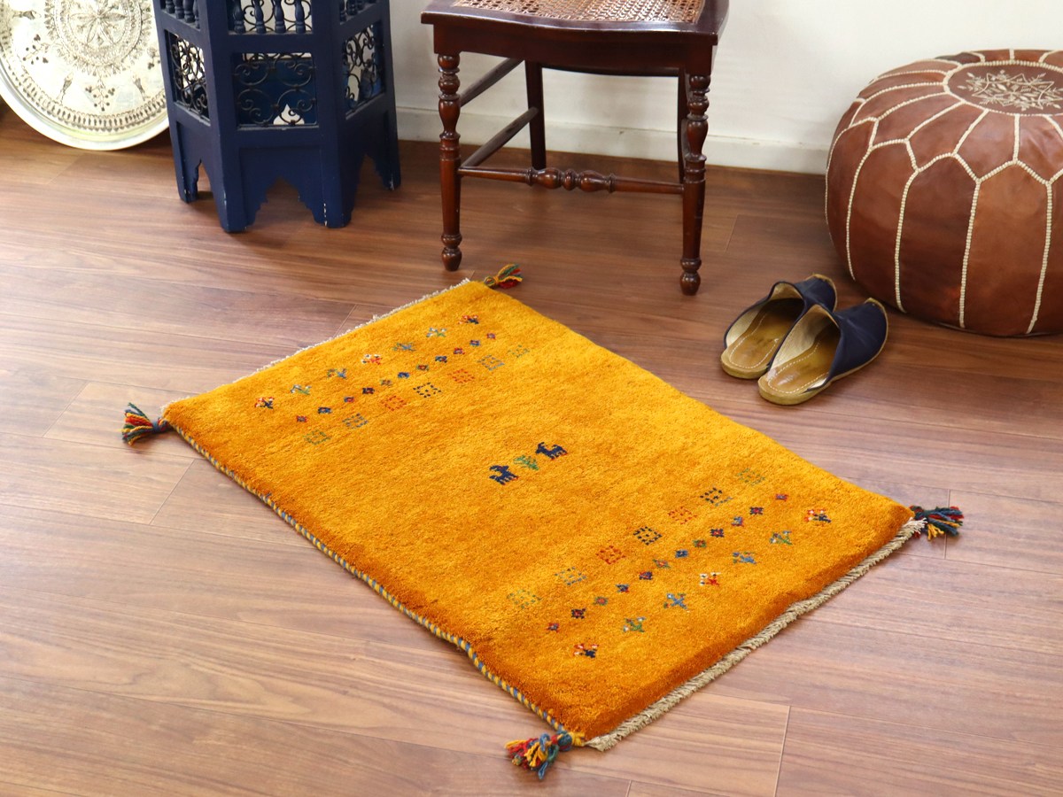 Key:Gabbeh, Tribal rug, Shiraz, Fars, Iran, Persia, Wool, ギャッベ, ふかふか, ギャベ, ラグ, 絨毯, イラン, イエロー, オレンジ 黄色 玄関マット シラーズ, ペルシャ, バザールギャッベ, ポンポン, 手織り, 草木染, 一点もの, 現品販売, 玄関マット, ガラタバザール