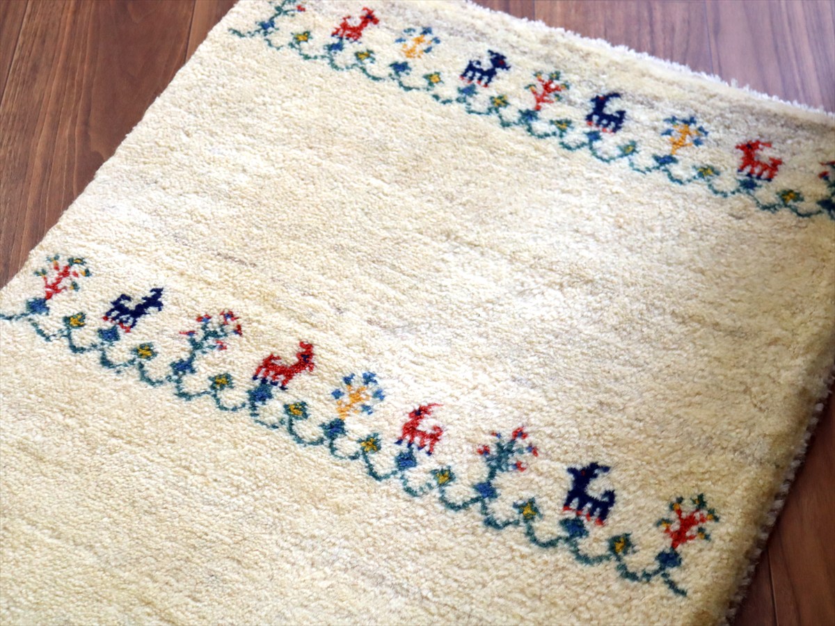 ギャッベ イラン産手織り 88×61cm 玄関マット ナチュラルアイボリー カラフルな動物を生命の樹