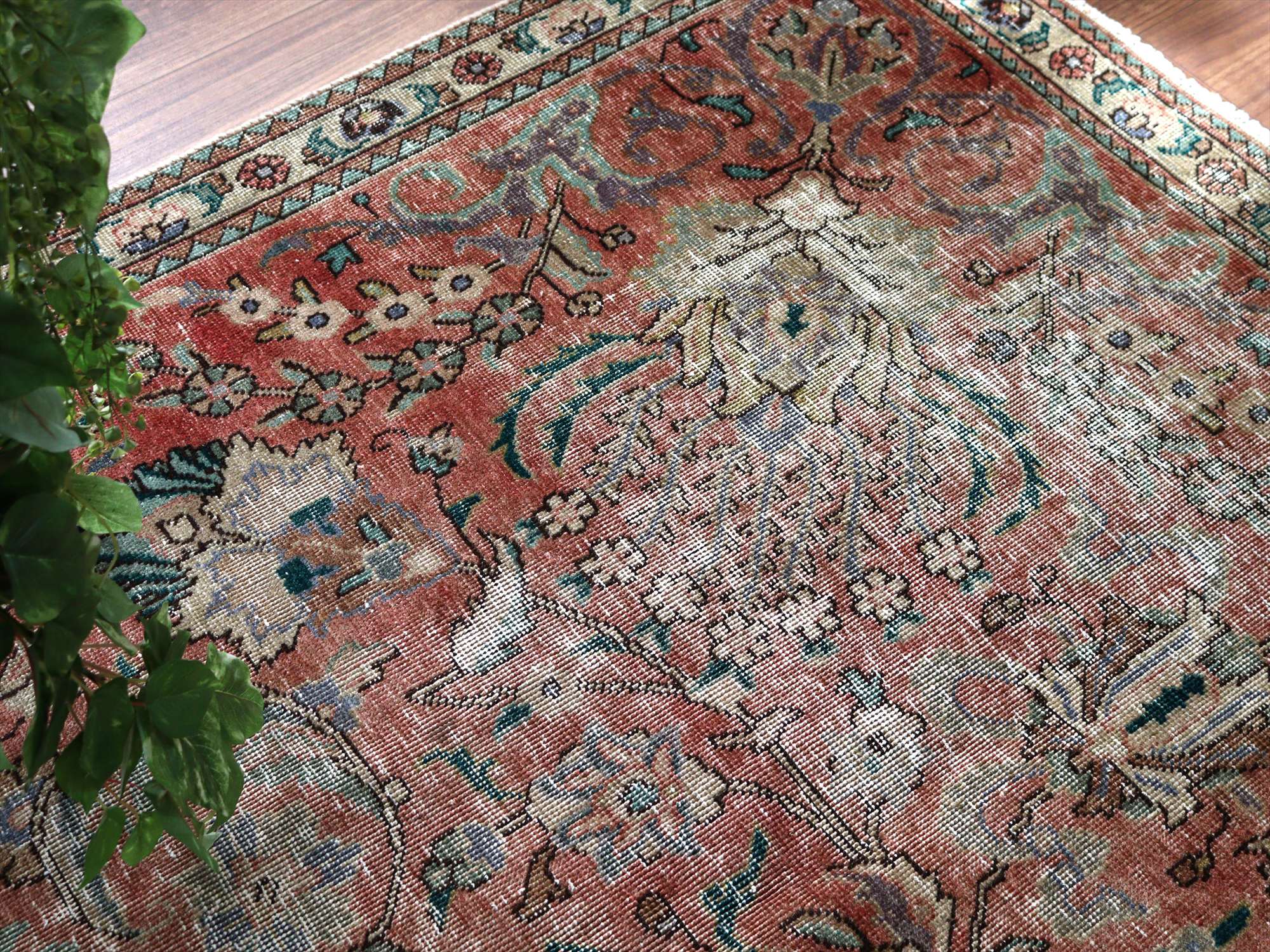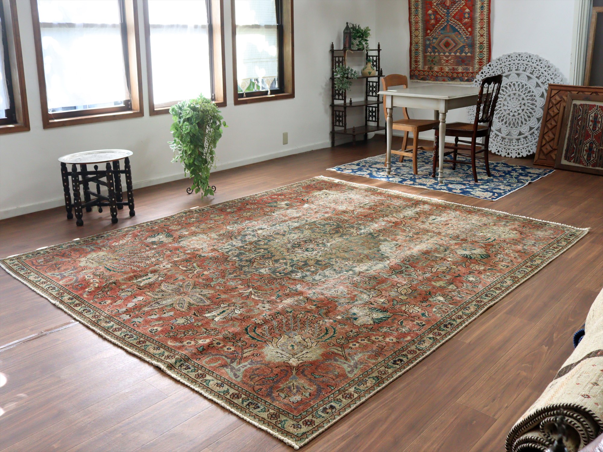 ダメージが多く、使われなくなった古い手織りカーペットを、洗った上でブリーチをかけたユーズドラグです。全体的に色褪せた雰囲気がよく出ていて、しっとりと落ち着いた印象に仕上がっています。オリジナルの絨毯は、イラン北西部、タブリーズ地方のもので、大きなメダリオン柄です。