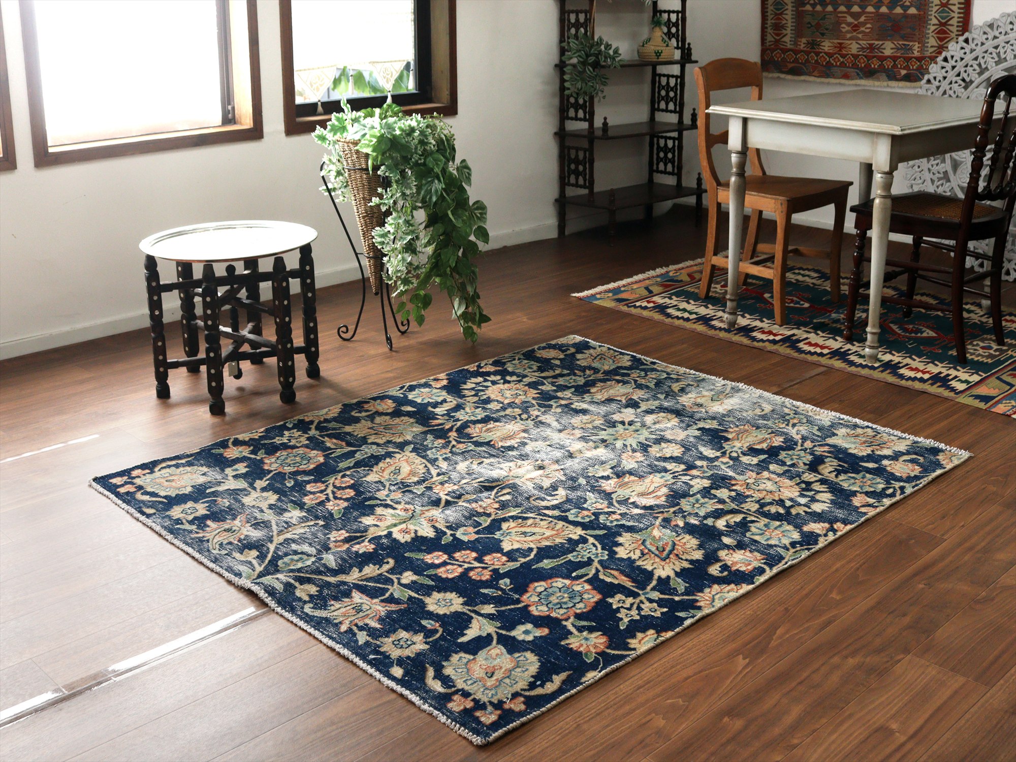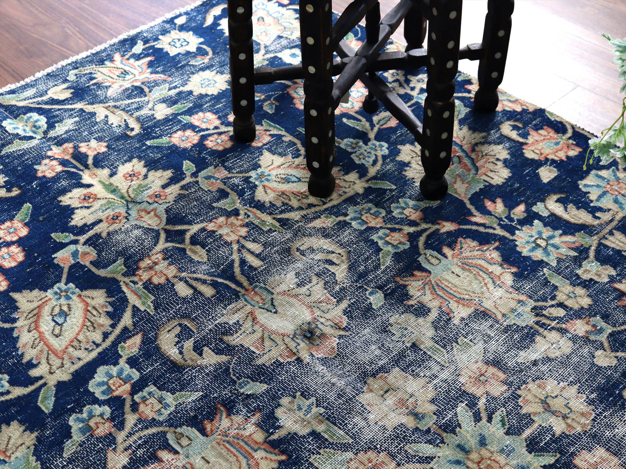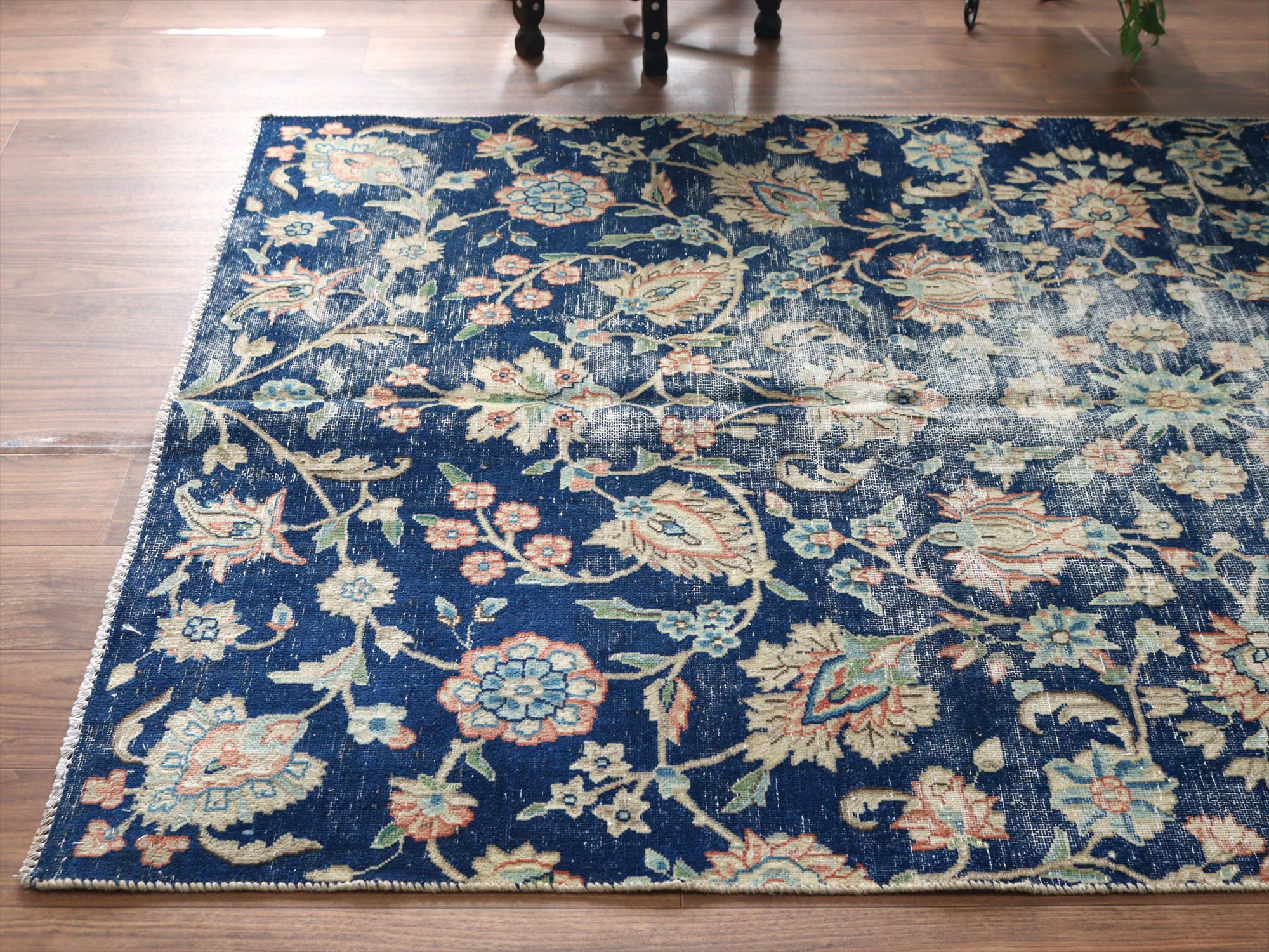 ダメージが多く、使われなくなった古い手織りカーペットを、洗った上でブリーチをかけたユーズドラグです。もともとは、周囲に額縁のデザインがあったものを、リサイズしてあります。