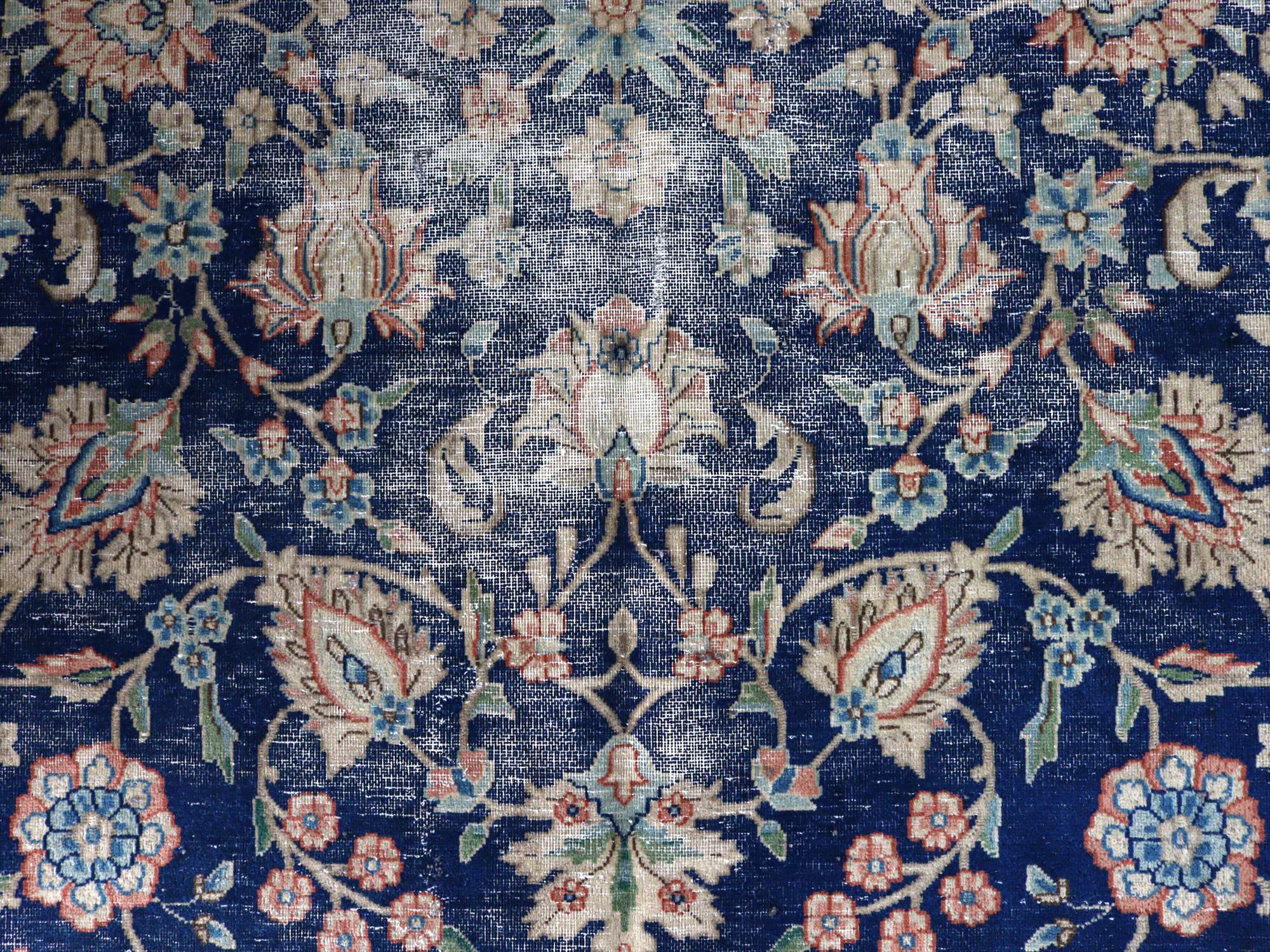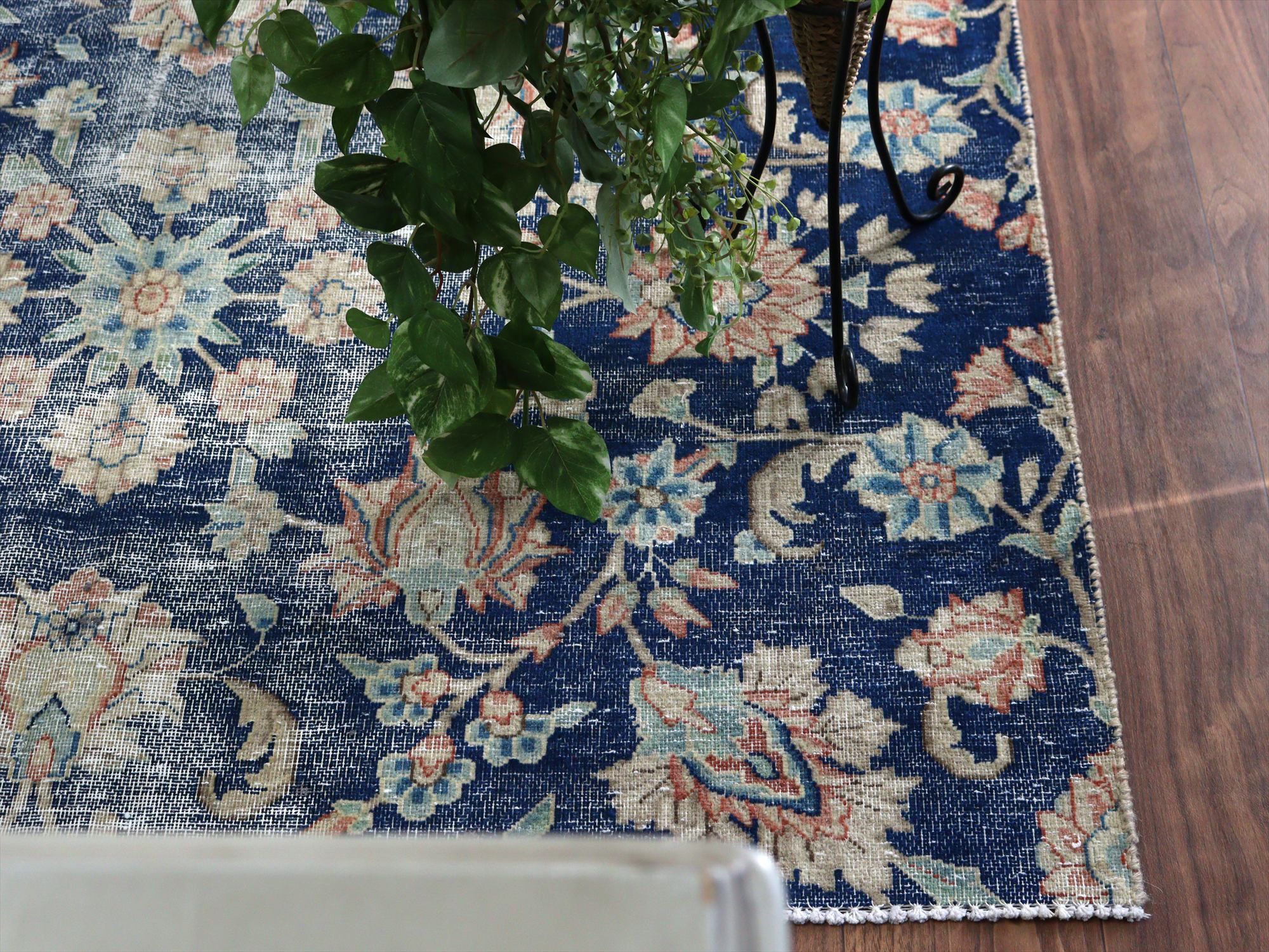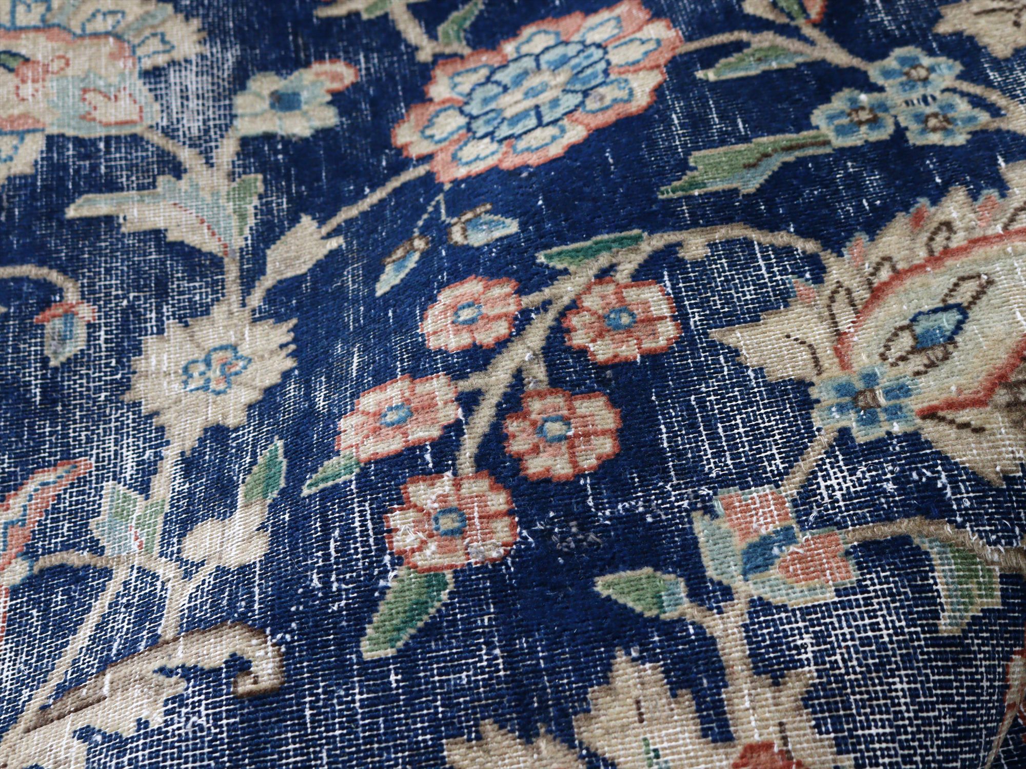 ダメージが多く、使われなくなった古い手織りカーペットを、洗った上でブリーチをかけたユーズドラグです。もともとは、周囲に額縁のデザインがあったものを、リサイズしてあります。