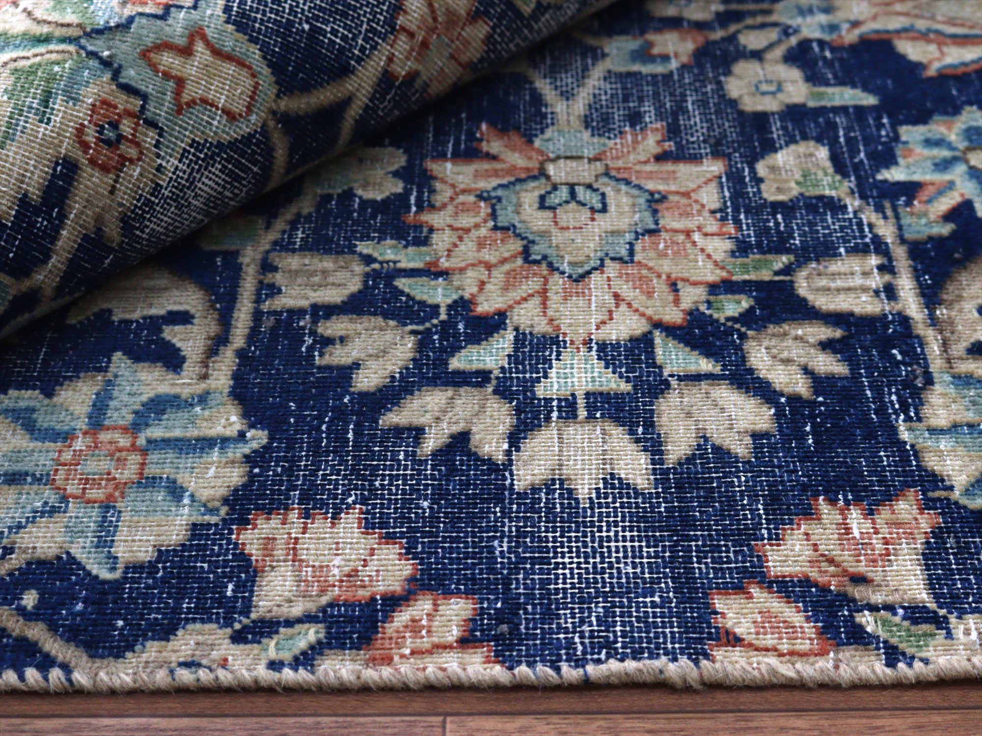 【ヴィンテージウォッシュ】長い間使われて、パイルのすり減りなどダメージのあるラグを、リサイクルするためにクリーニング、ブリーチ加工したアップルサイクルの手織りラグです。ダメージ部分も、年代を経たラグならではの味わいととらえています。ブリーチ(脱色)したあとに、別の色に染めたものをオーバーダイドラグと呼んでいます。