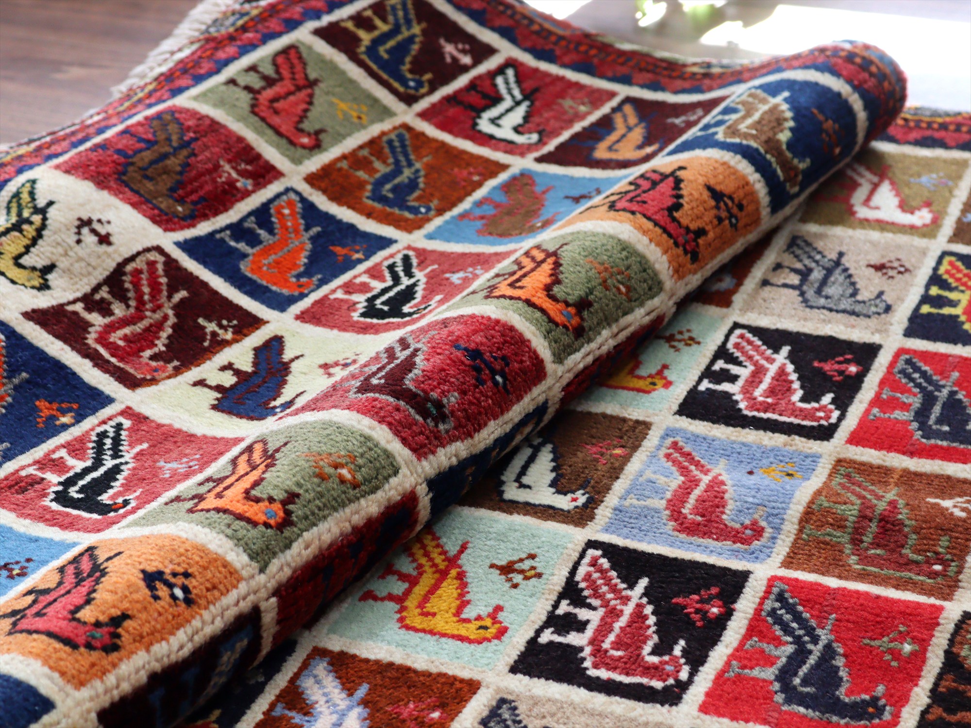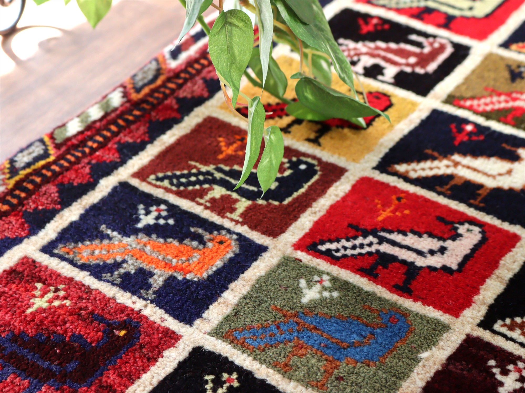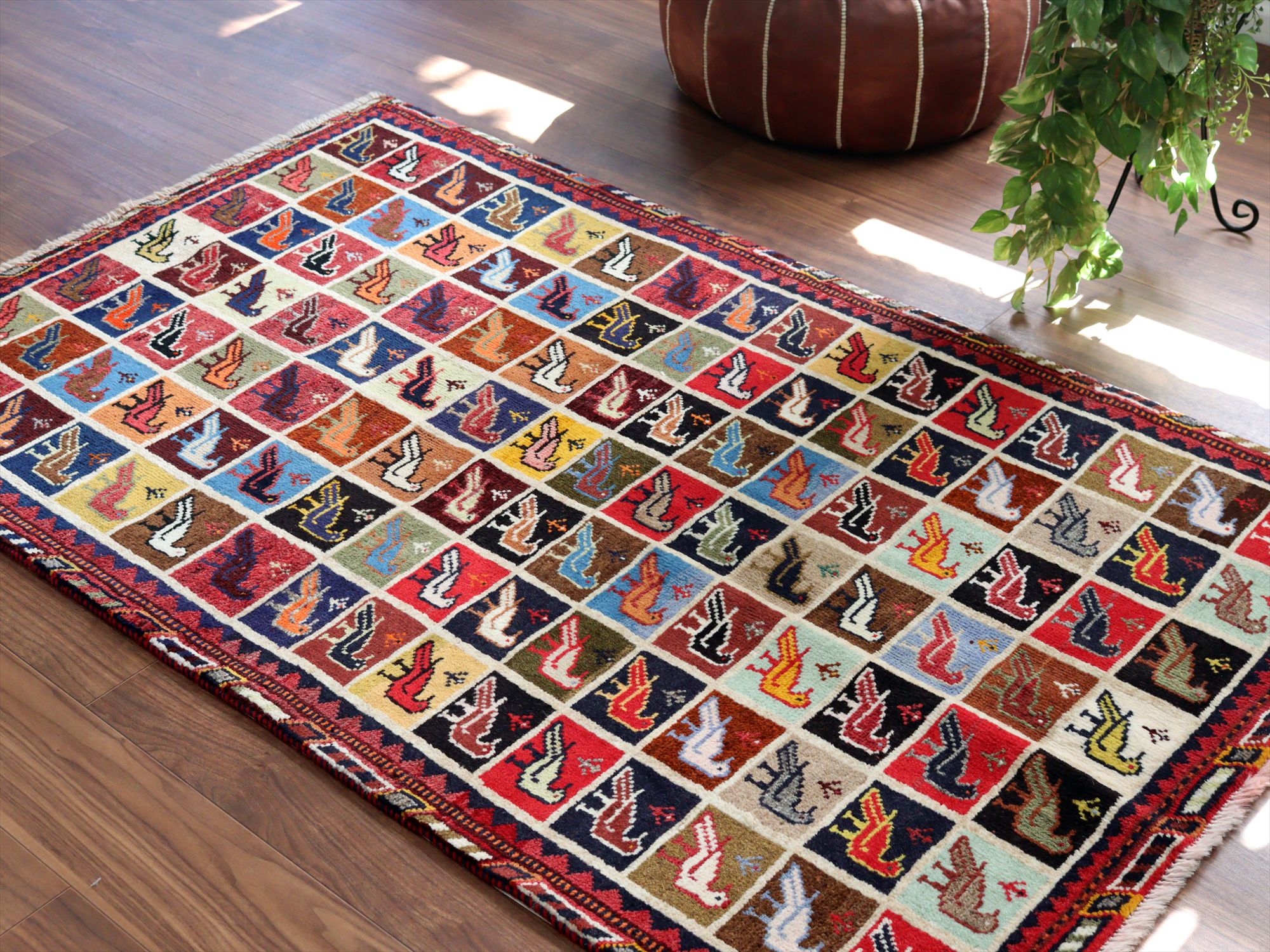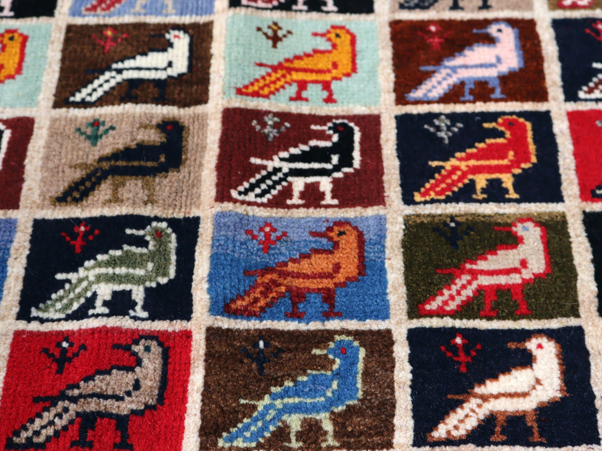 - 手織りギャッベ バード トレリスデザイン 170x105cm カラフルタイル 鳥