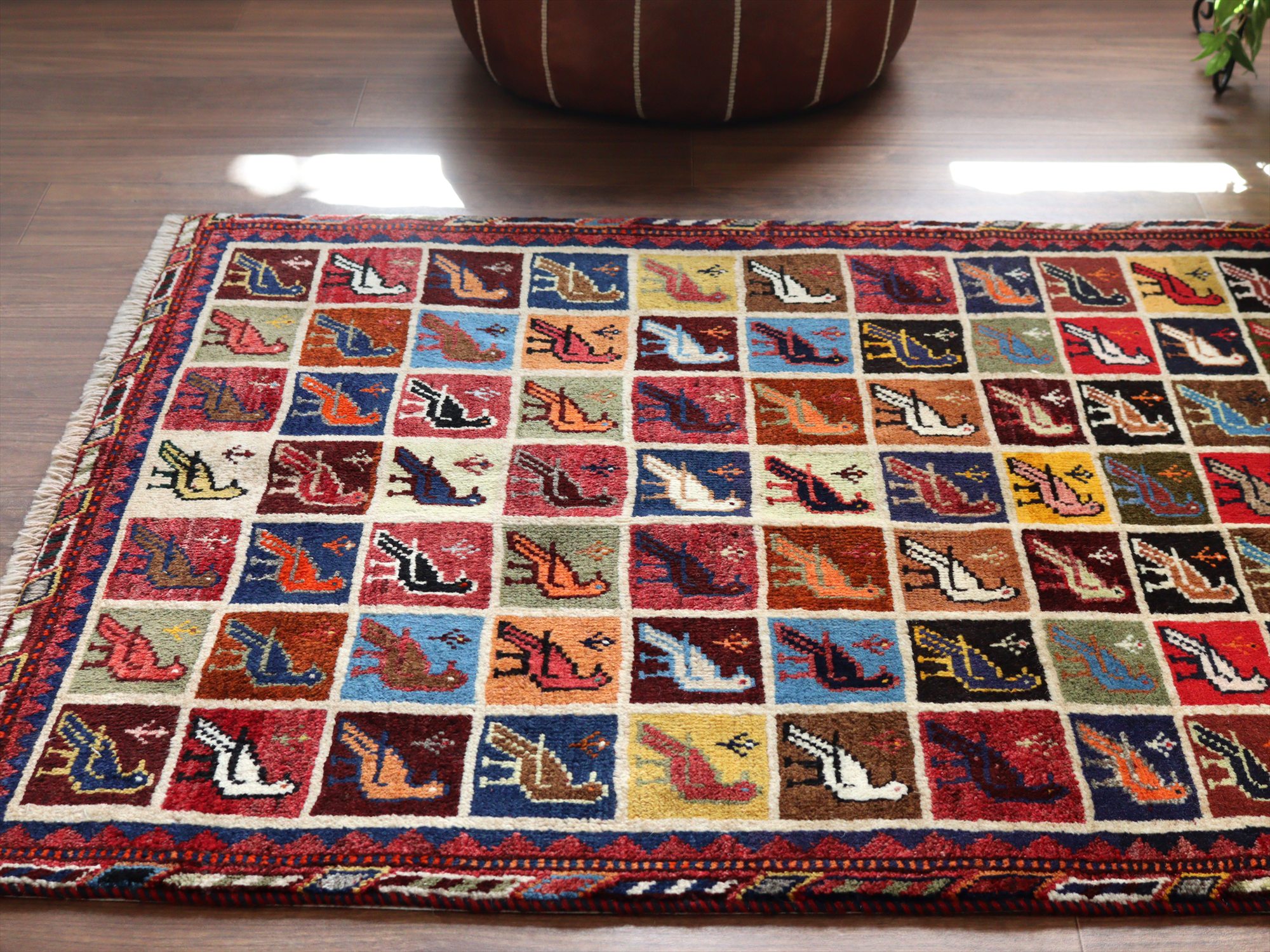 鮮やかな色使いで、格子状に鳥が色を変えながら織られたユニークなデザイン。振り向いたようなポーズが愛らしいです。ボーダー(額縁部分)のデザインも凝っていて、色使いデザインともに目を引く1枚です。