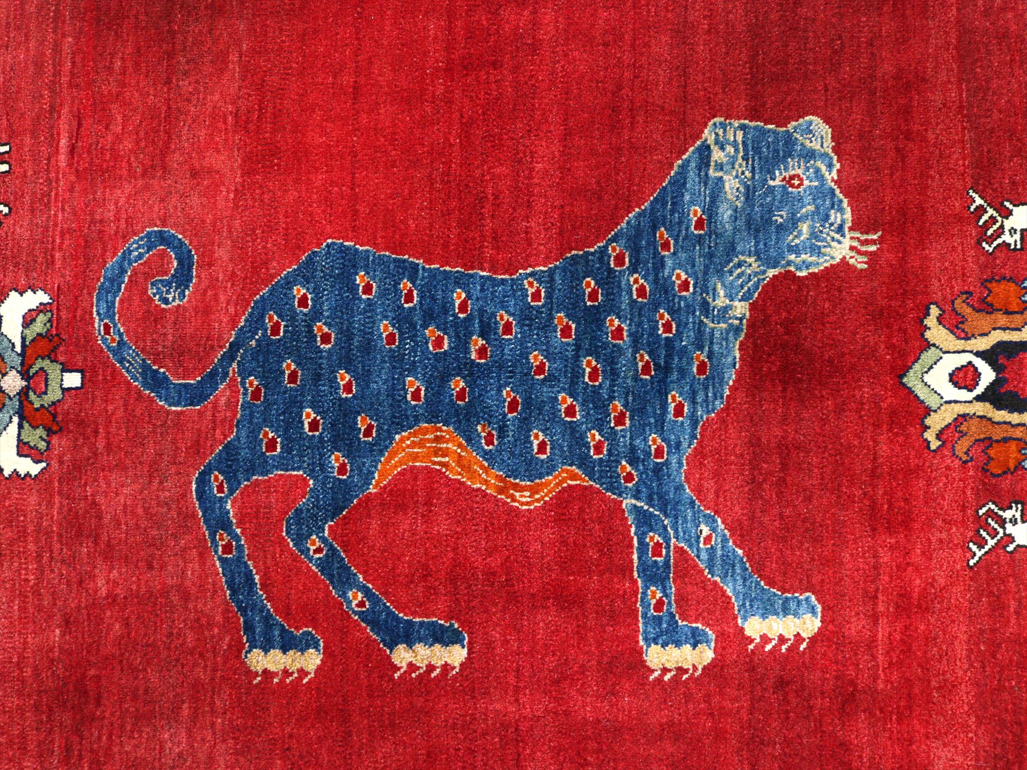 カシュカイ族の象徴でもあるライオンとともに、よく登場する豹のデザイン(メスのライオンとも言われています)。中央に1頭がシンプルに織り込まれるデザインが多い中、このギャッベはヒョウの上下にパルメットと白い鹿が織り込まれたユニークな配置です。絨毯として縦にも横にも使えそうです。