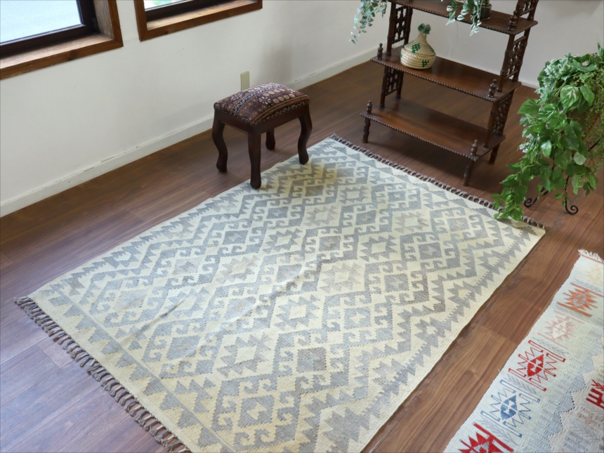 平織りのキリムとしては、がっしりとした厚みのある素朴な織りで、めくれにくくフロアに敷いても頼りない感じではなく、実用的です。表面はややザラっとした手触りです。