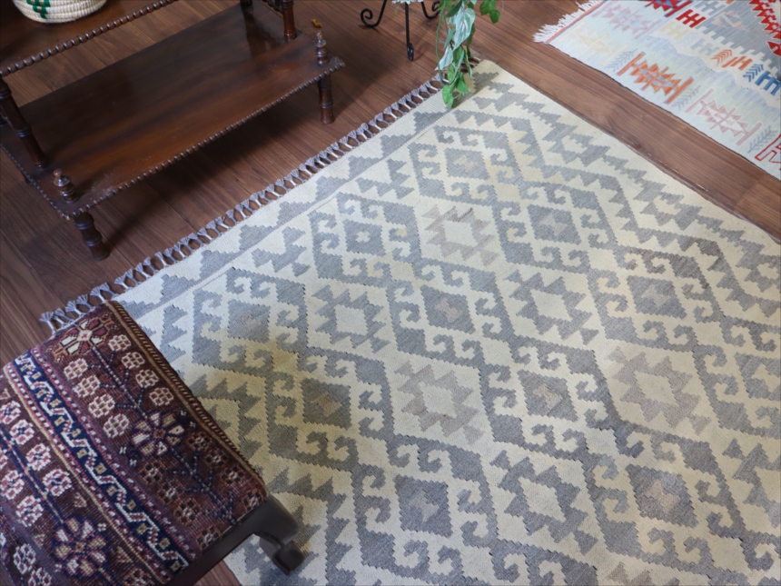 key:Kilim, Tribal rug, handmade, Persia, Quashkai, Nomad, Wool, キリム, トライバルラグ, ペルシャキリム, 手織り, ウール モノトーン シンプル ベージュ グレー 幾何学柄