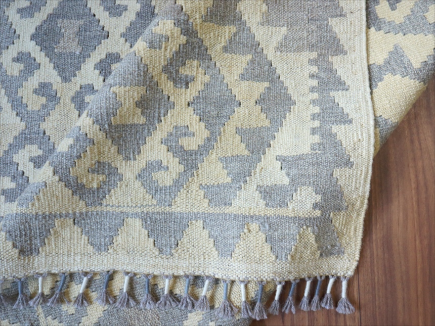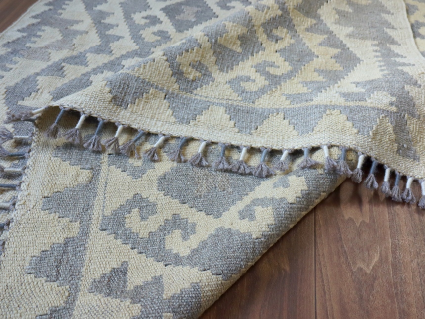 アフガニスタンで現在織られている、手織りのウールキリムです。経糸にグレーの羊毛が使われているほか、上下のフリンジは丁寧にカラフルな糸で巻いてあります。