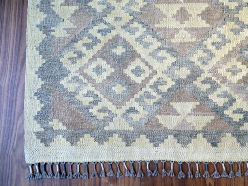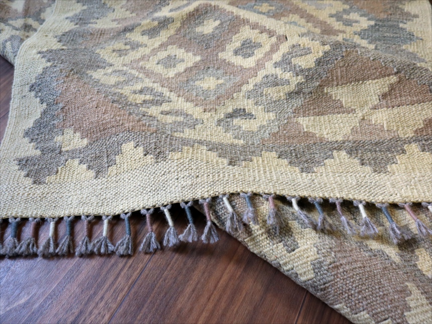 アフガニスタンで現在織られている、手織りのウールキリムです。経糸にグレーの羊毛が使われているほか、上下のフリンジは丁寧にカラフルな糸で巻いてあります。